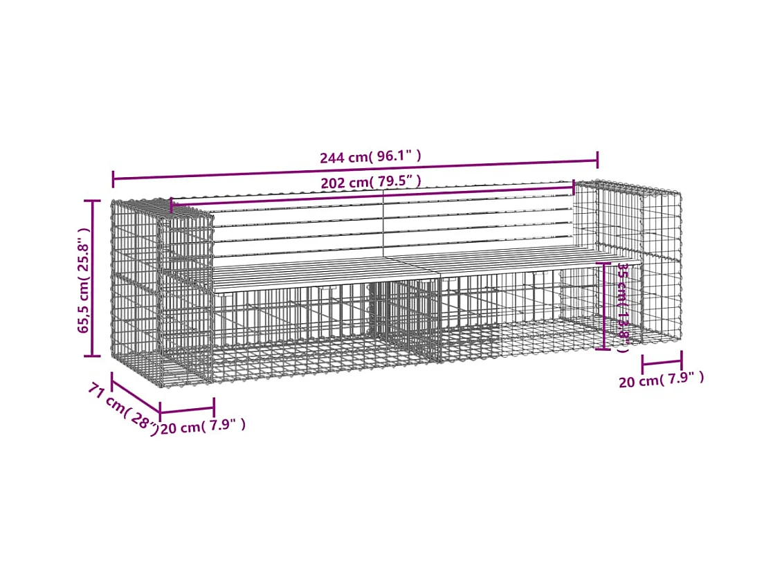 Banco de jardim c/ design gabião 244x71x65,5cm pinho impregnado