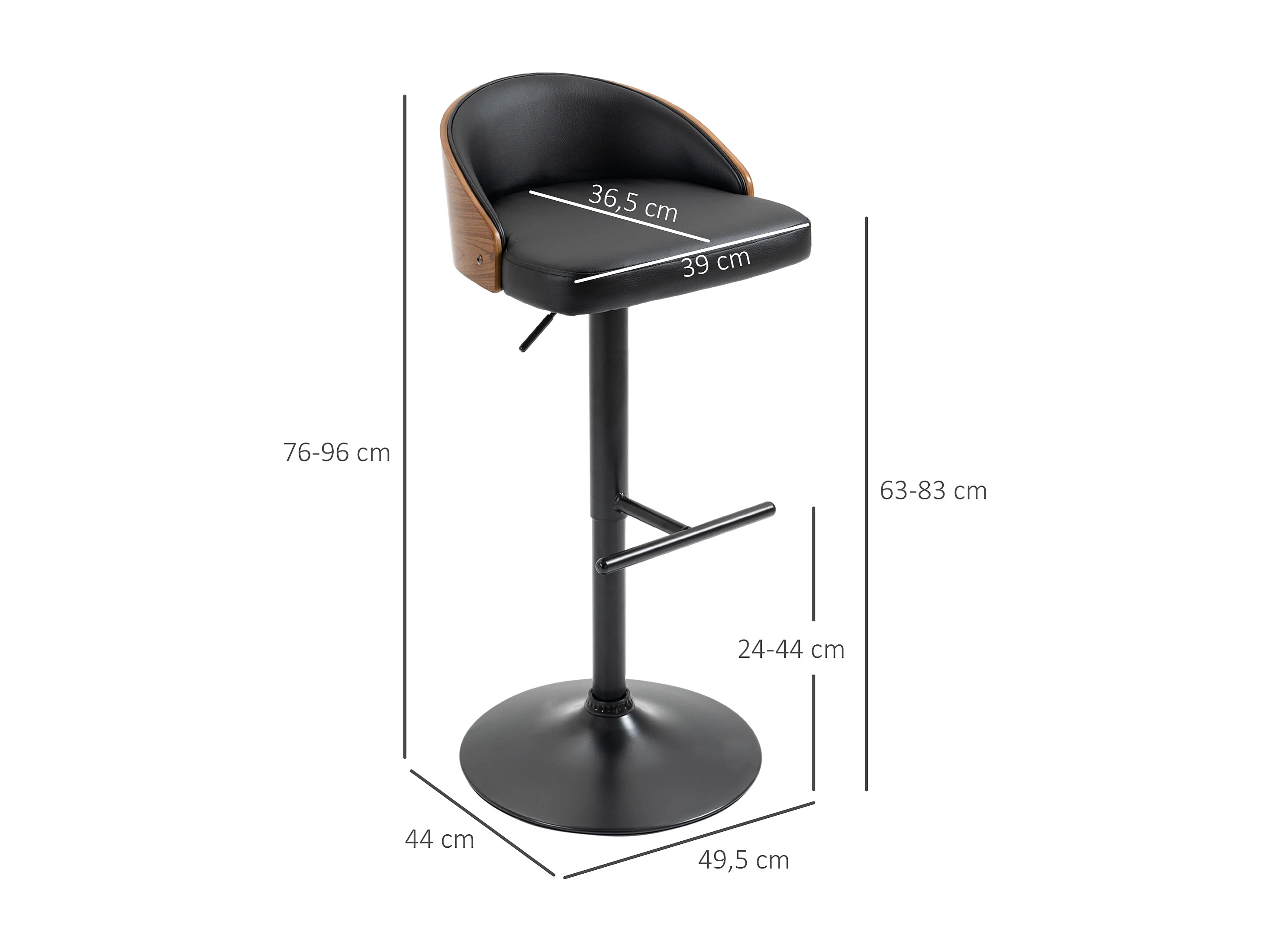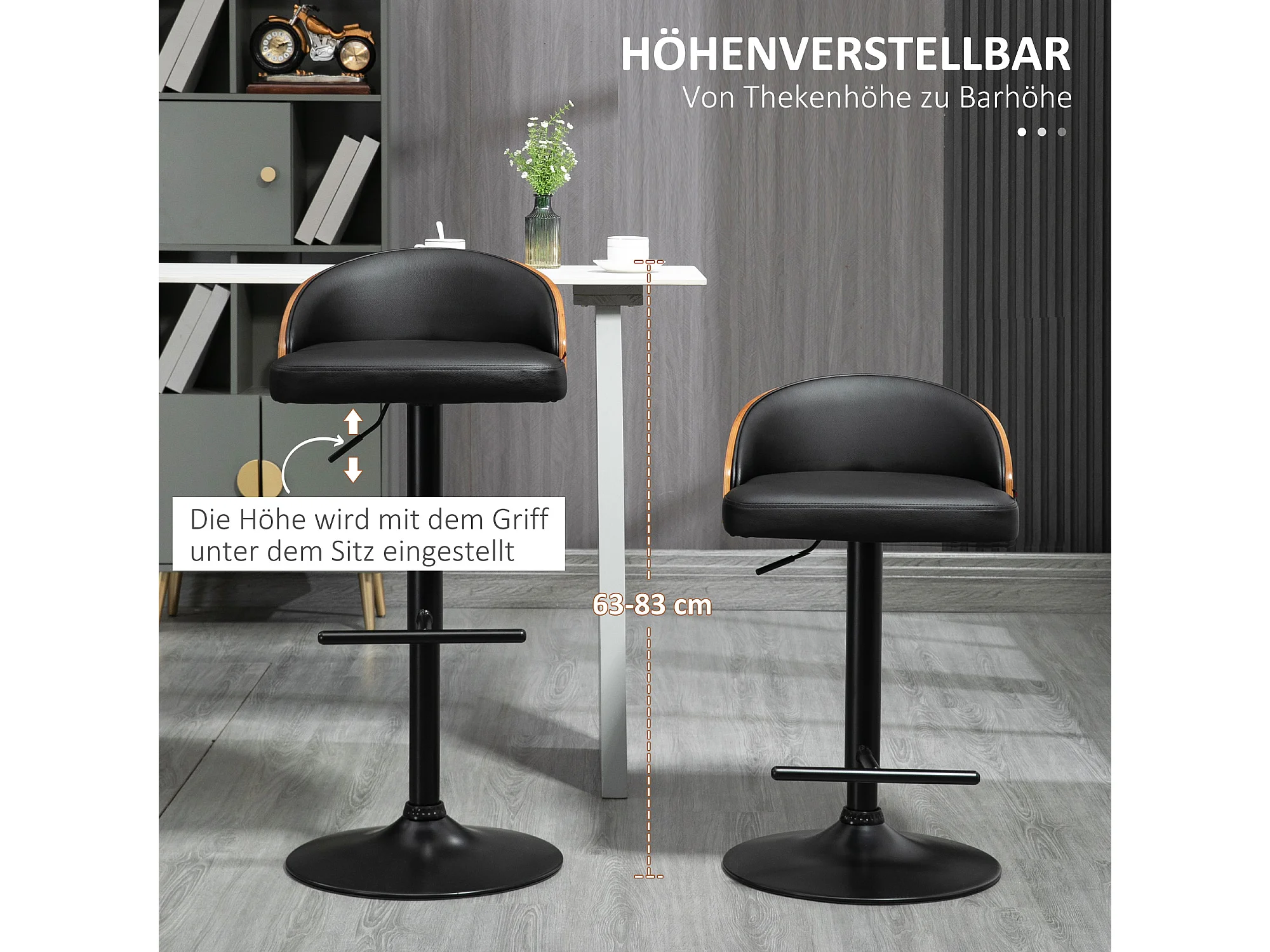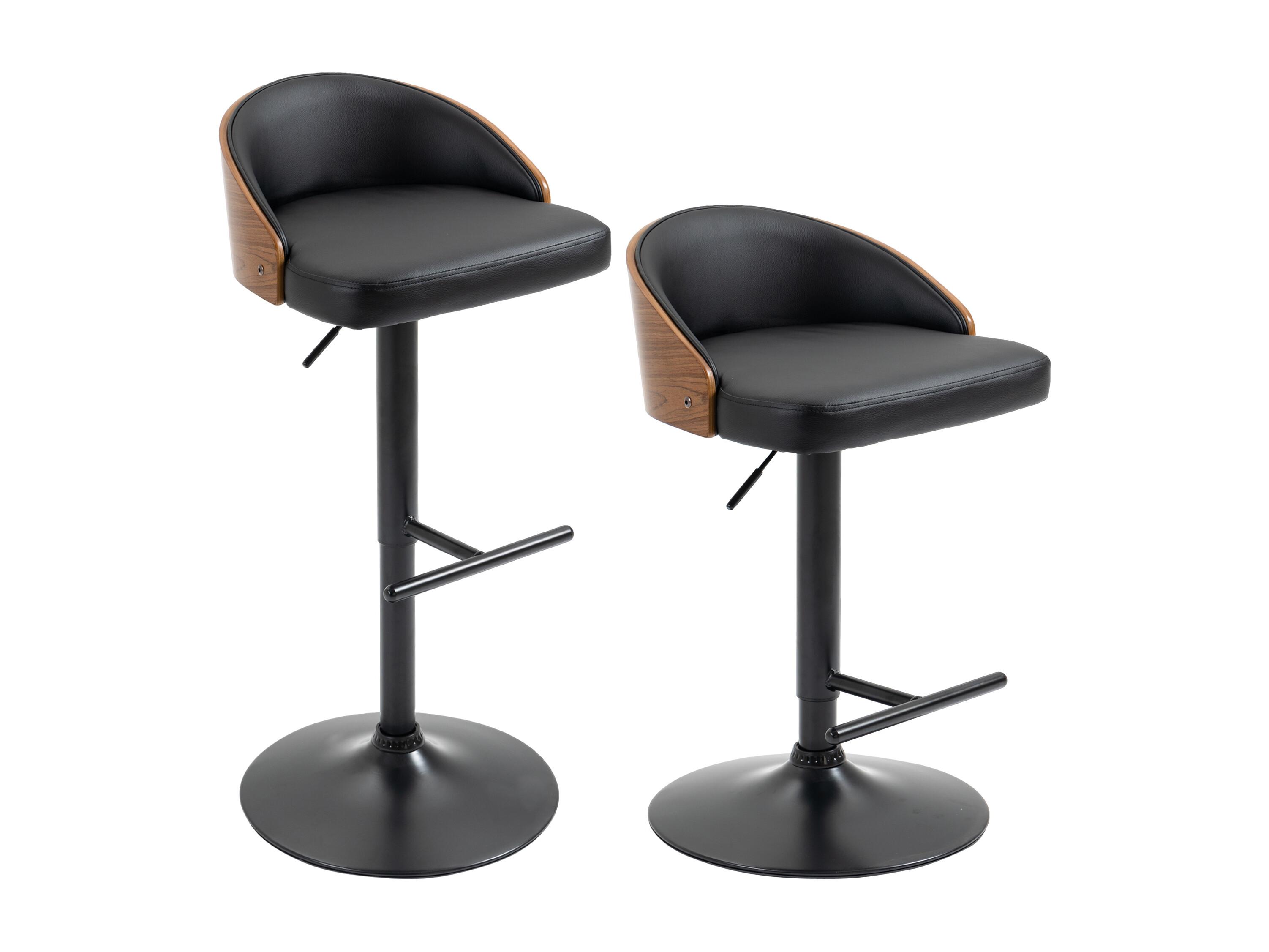 Bancos de bar giratórios ajustáveis de 2 peças em couro sintético e madeira com apoio para os pés, pretos, 48 x 49,5 x 96 cm