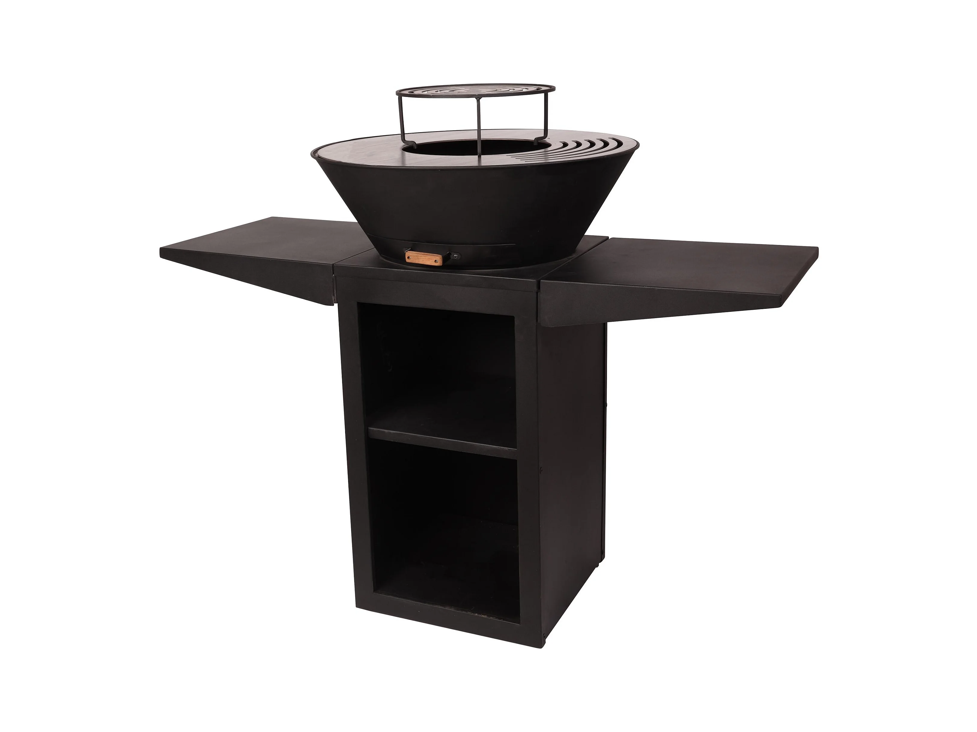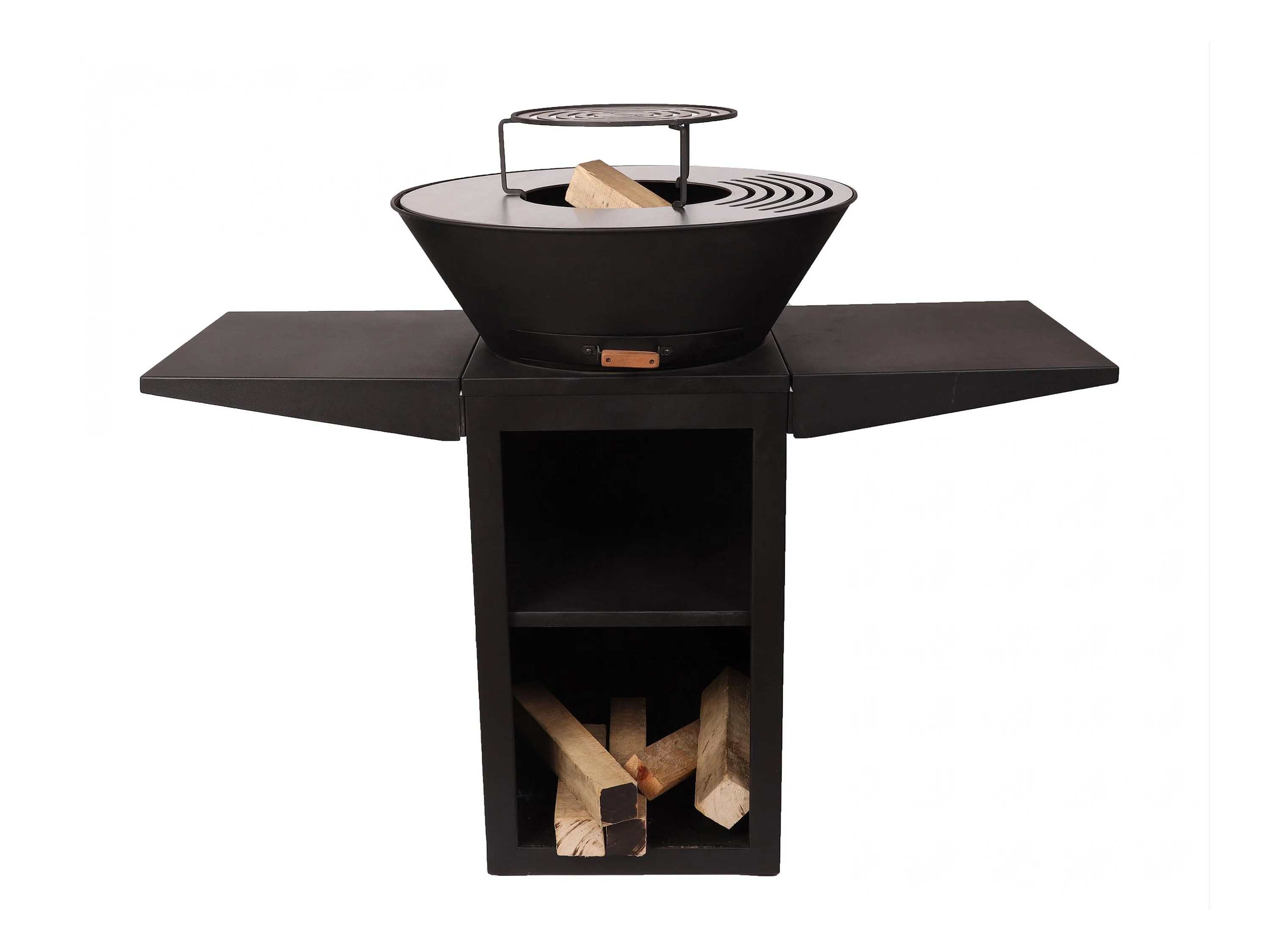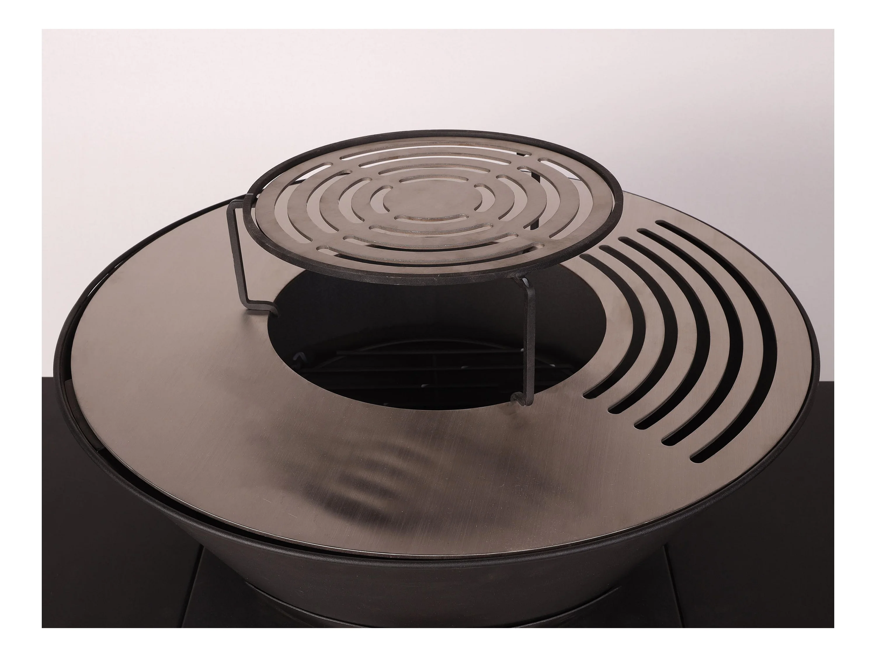 Grelhador redondo com grelha e placa de grelhar em aço e tábua de madeira