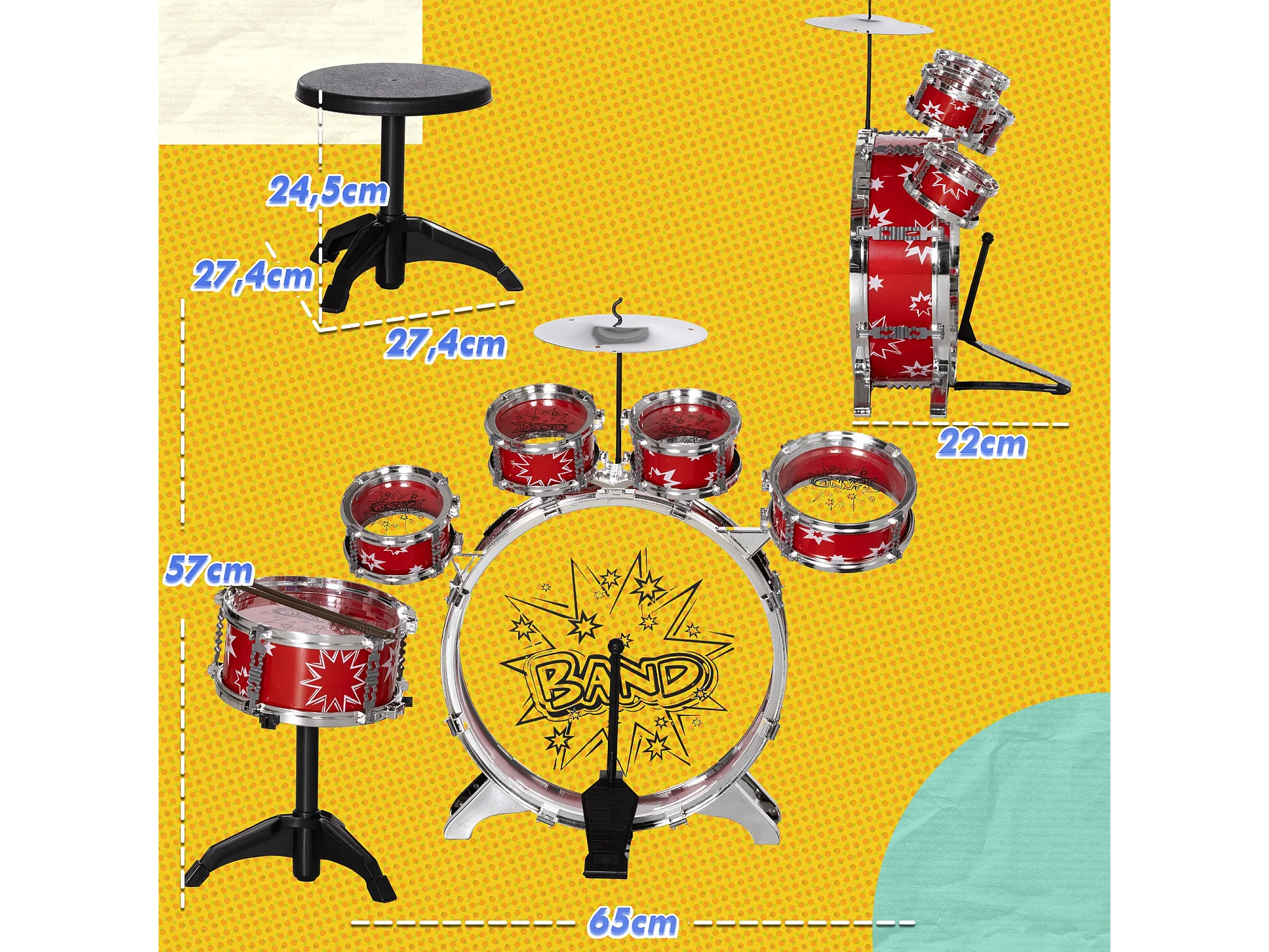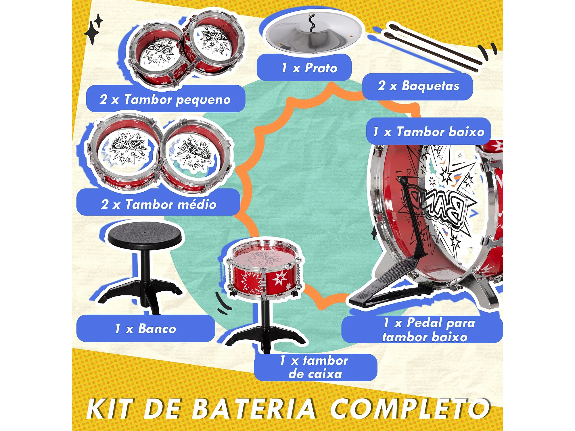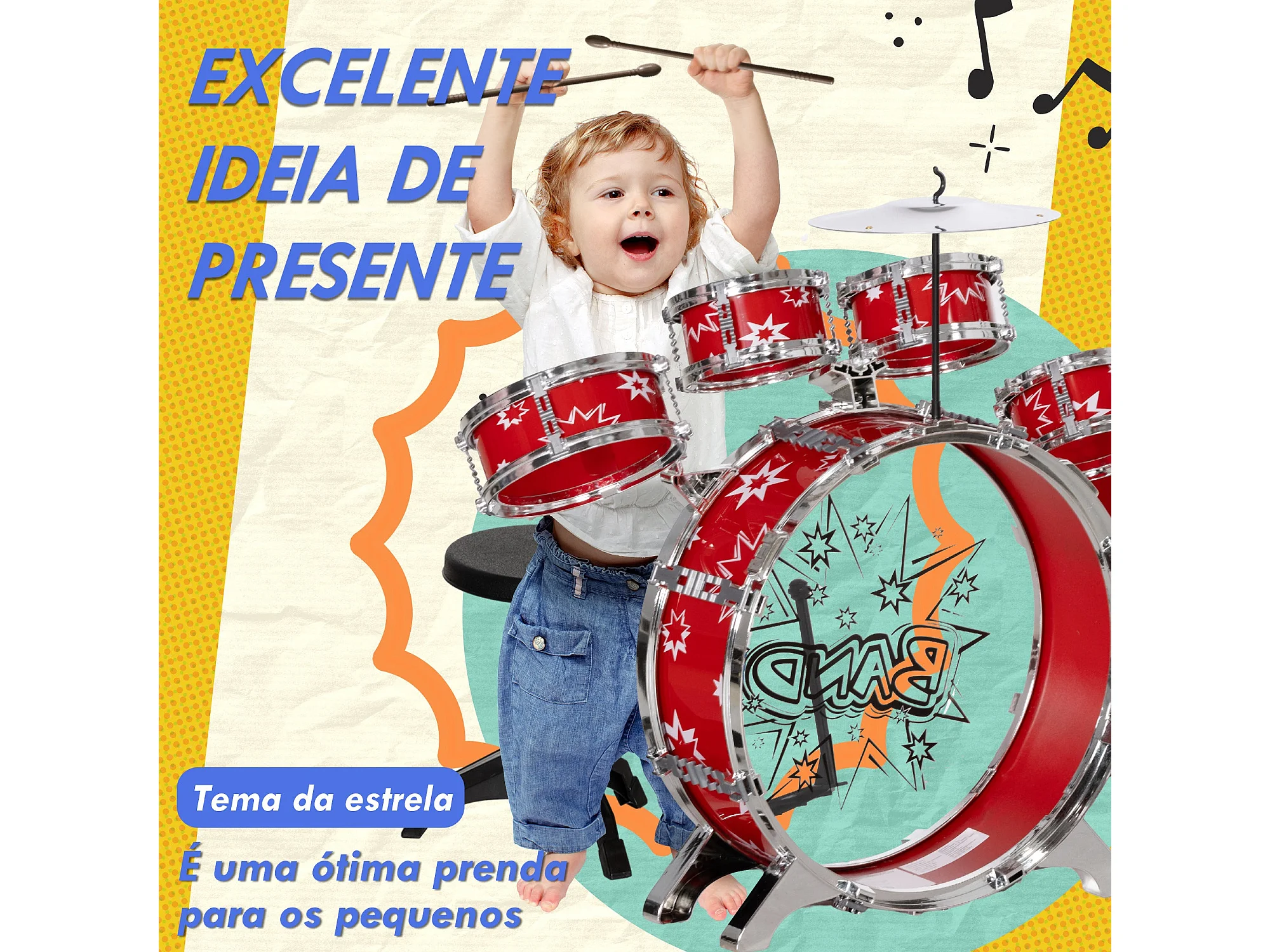 Bateria Infantil AIYAPLAY com Banco e Tambores - Musical para Crianças a Partir de 3 Anos - Tema Estrelas - Vermelho