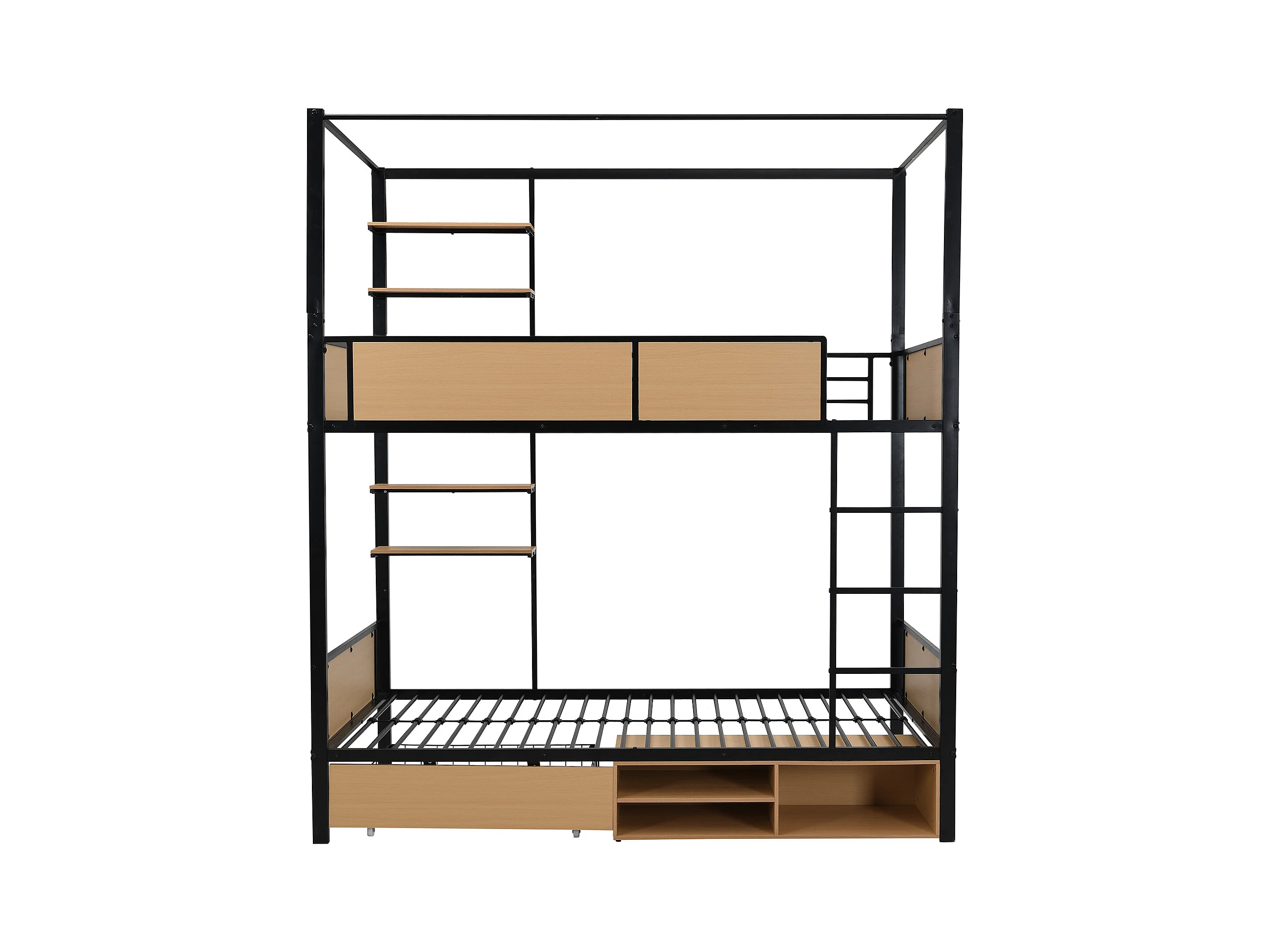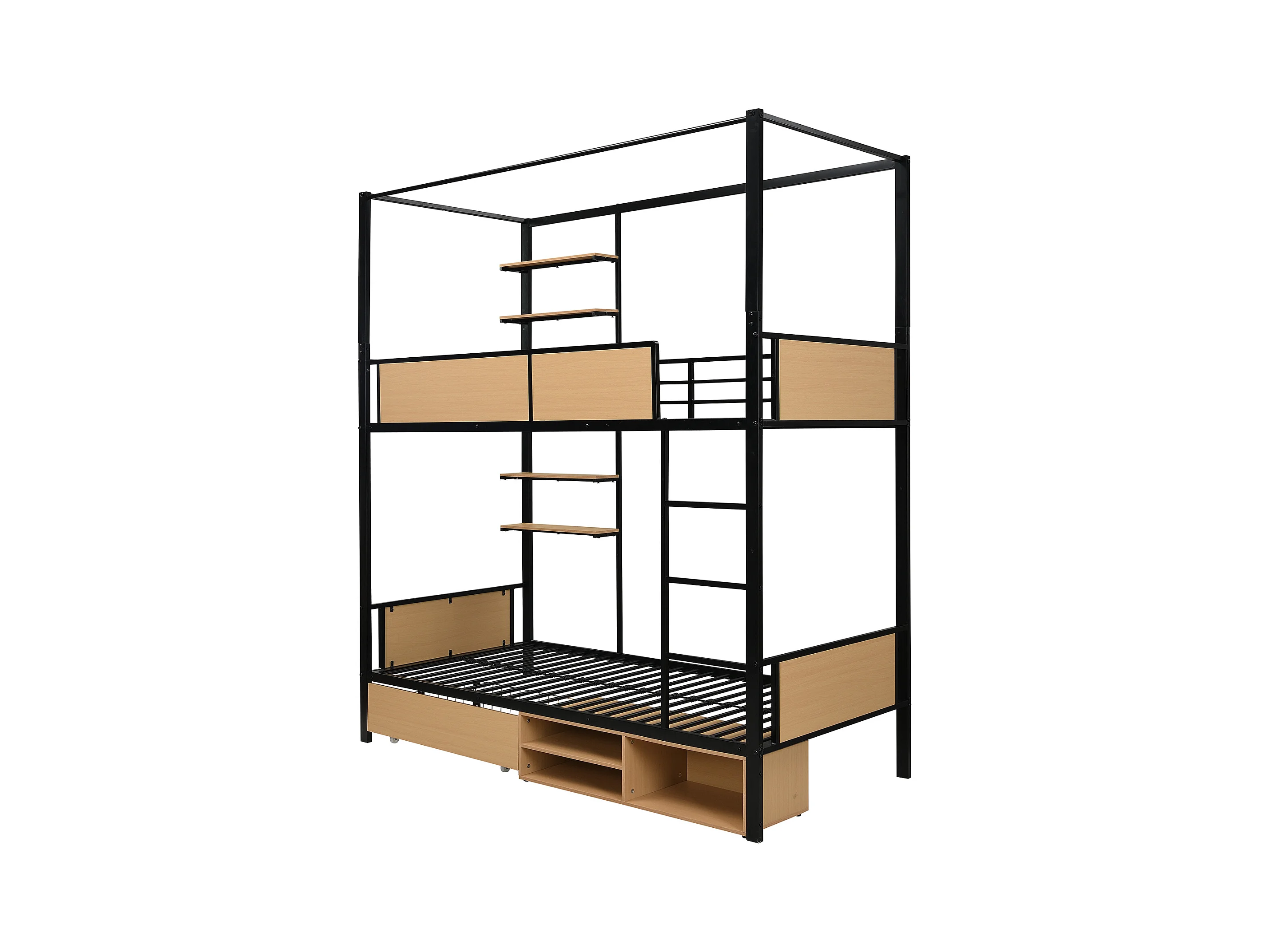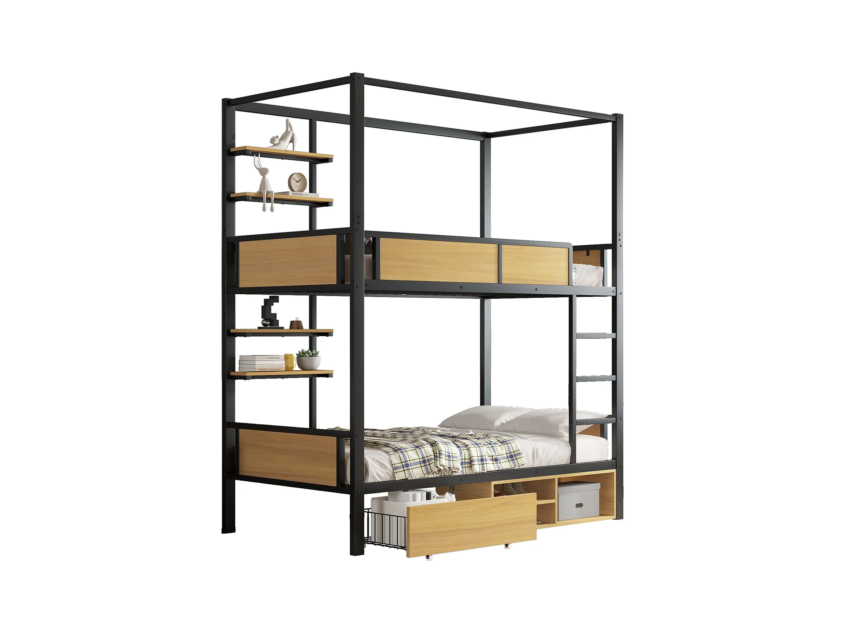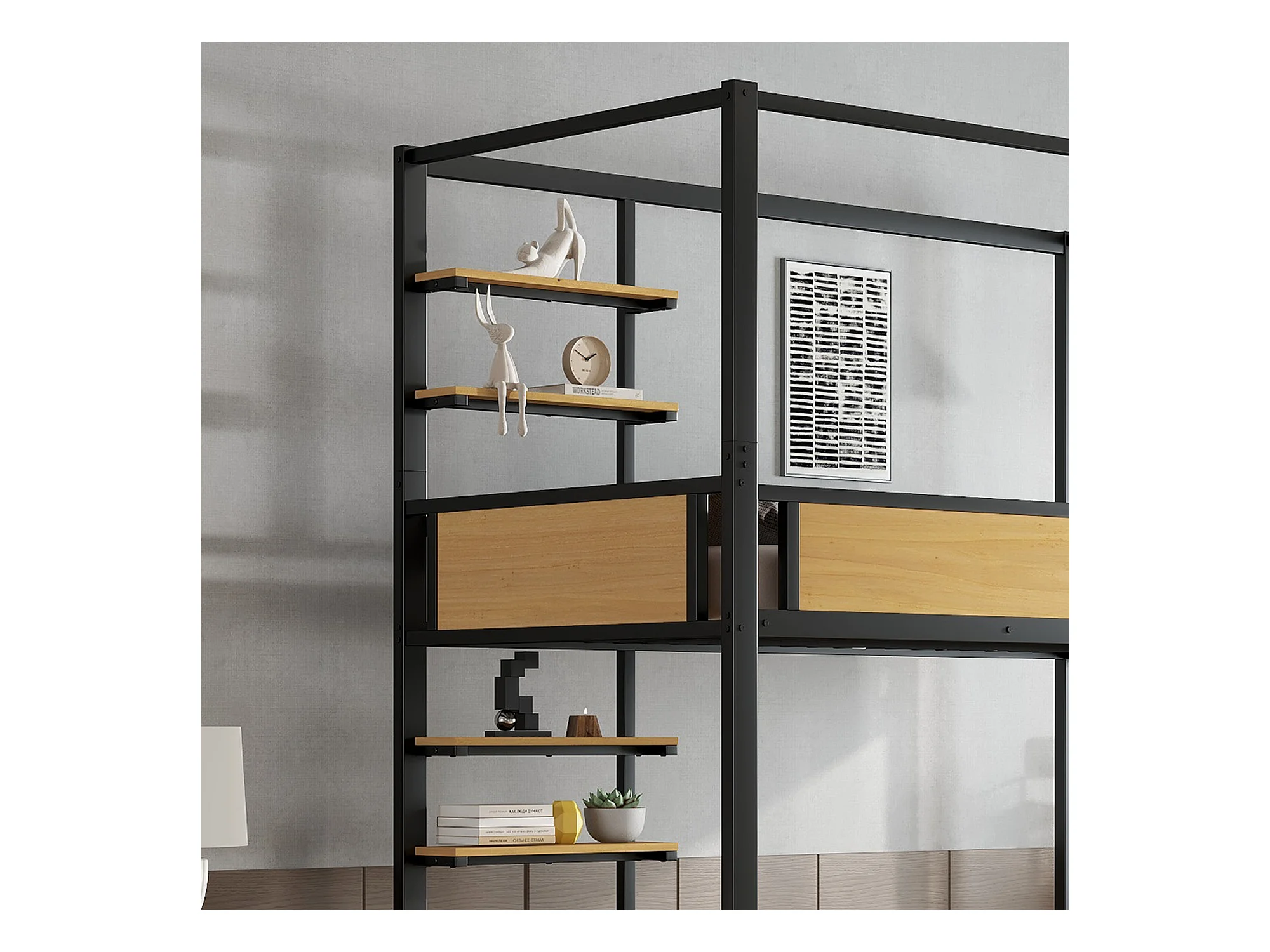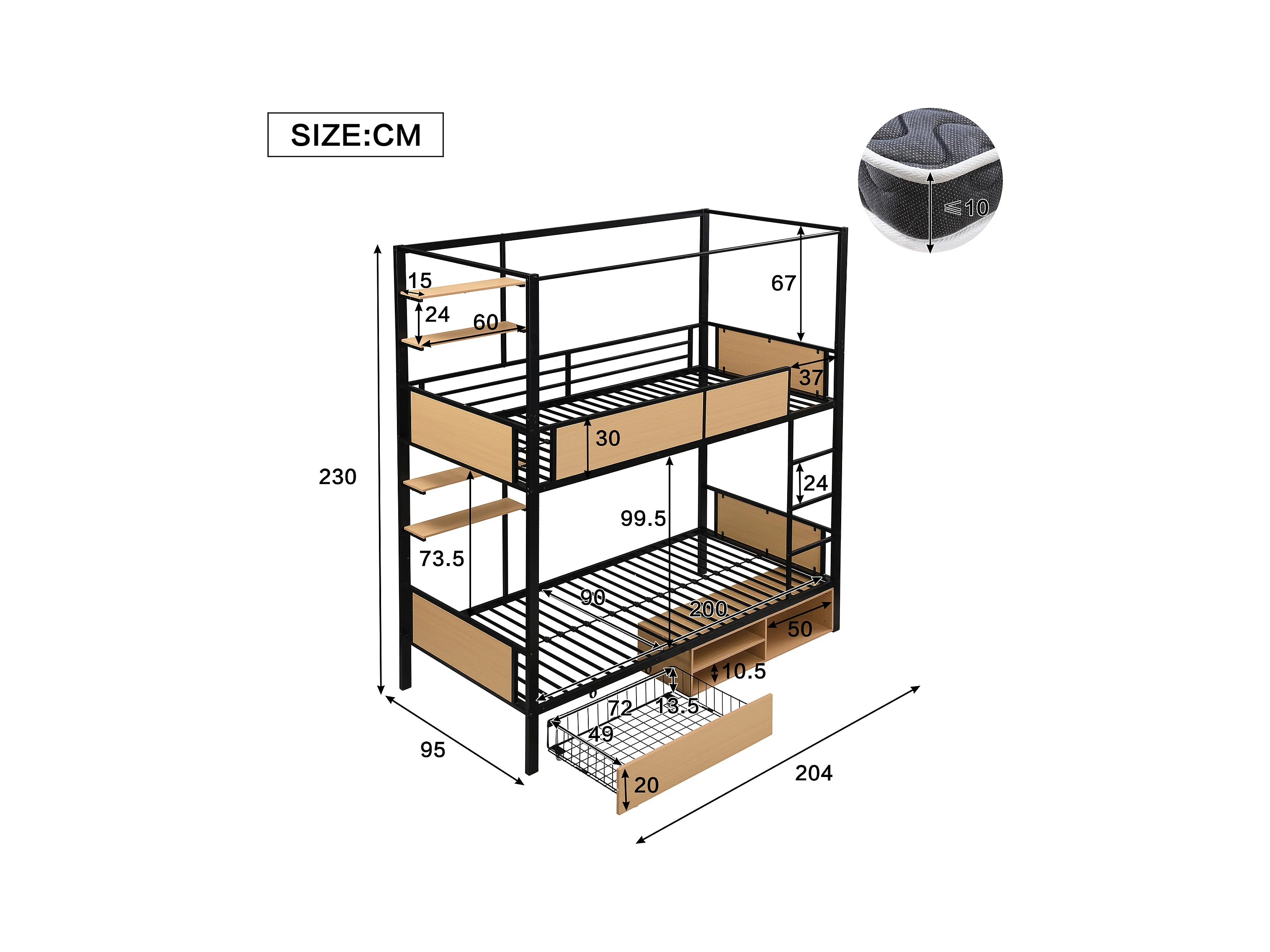 Beliche 90×200 cm - com prateleira - com 1 gaveta e compartimento de armazenamento - Metal + MDF - Preto + Natural