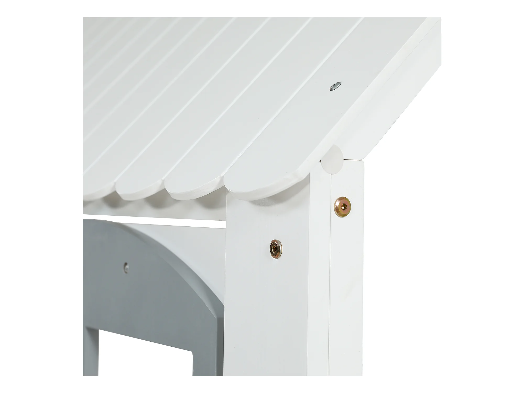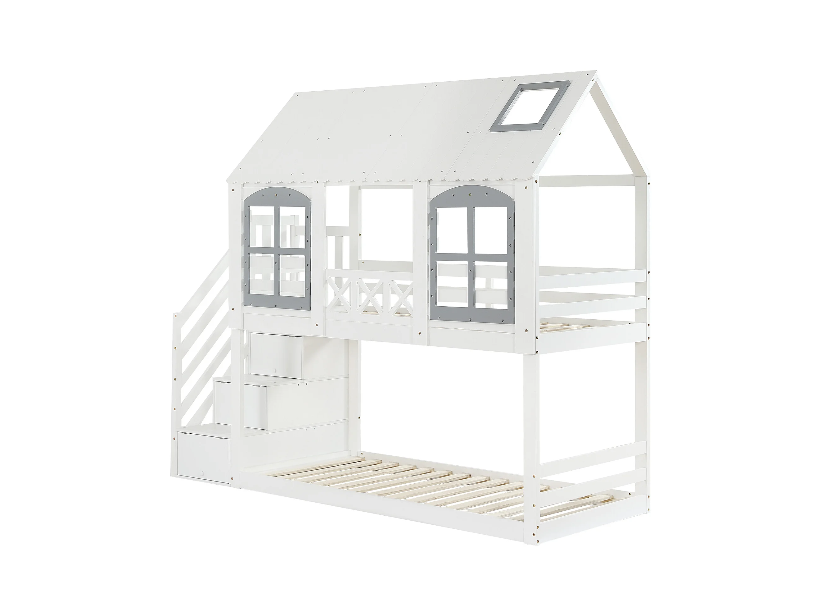 Beliche 90x200cm, cama infantil com grade de segurança e 3 compartimentos de arrumação na escada, Pinho + MDF, branco + cinza, Sem colchão