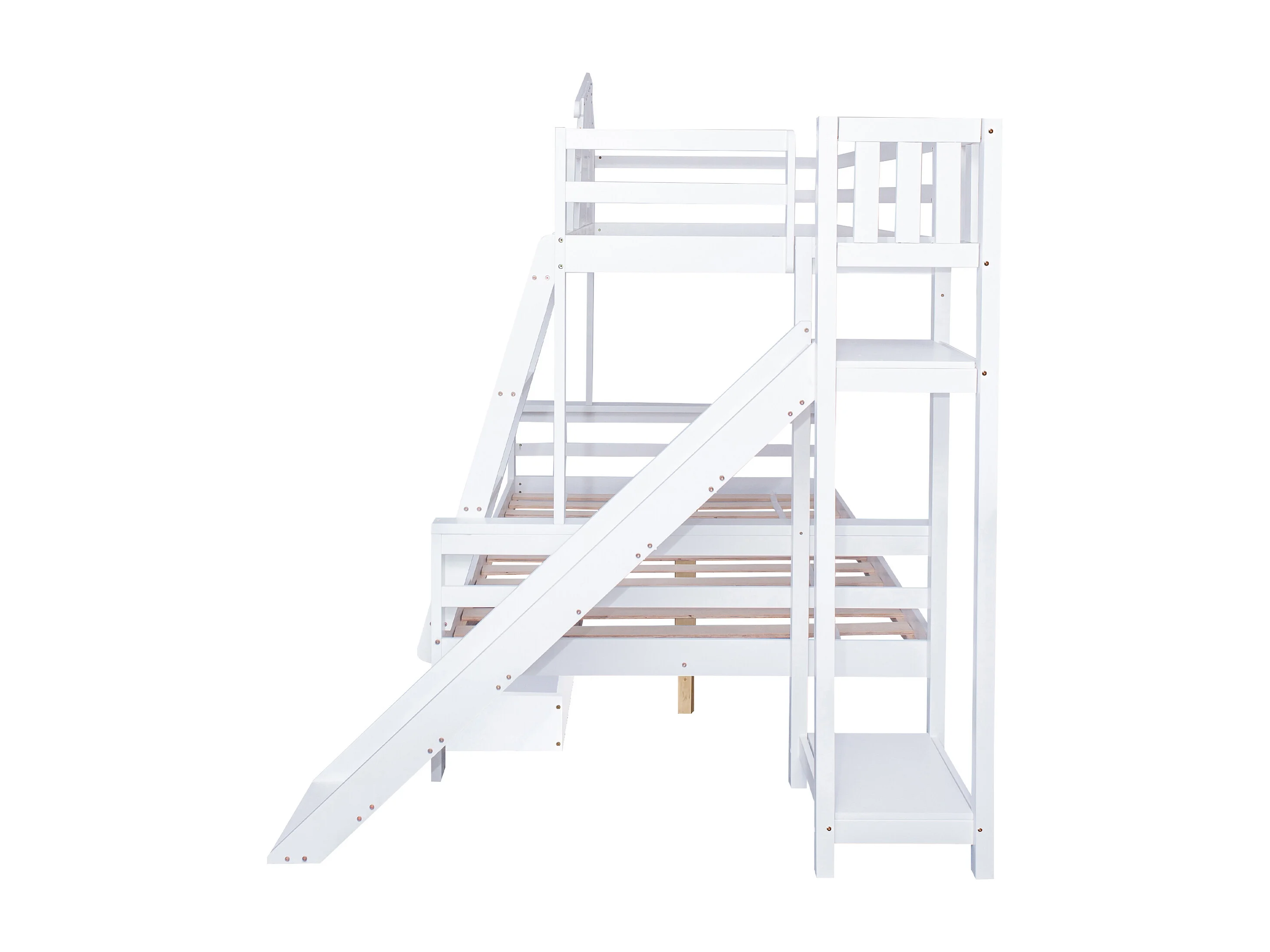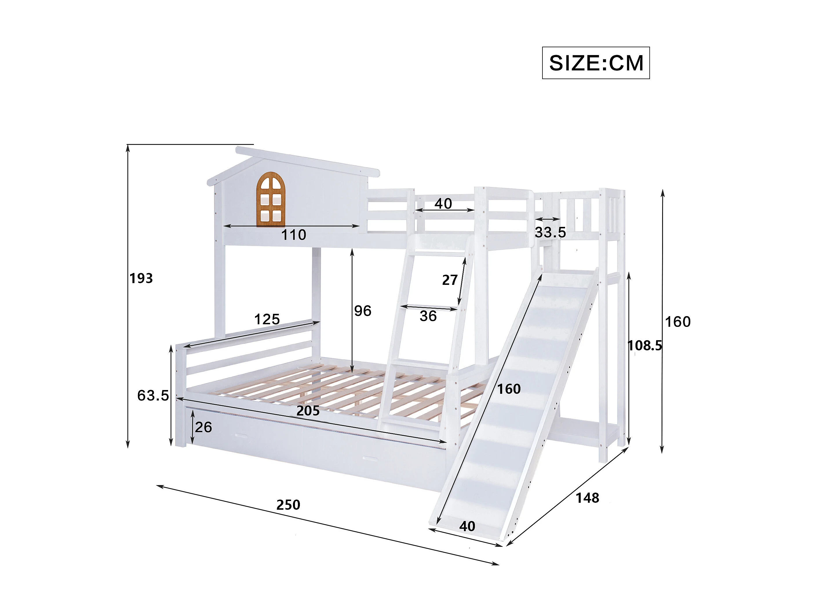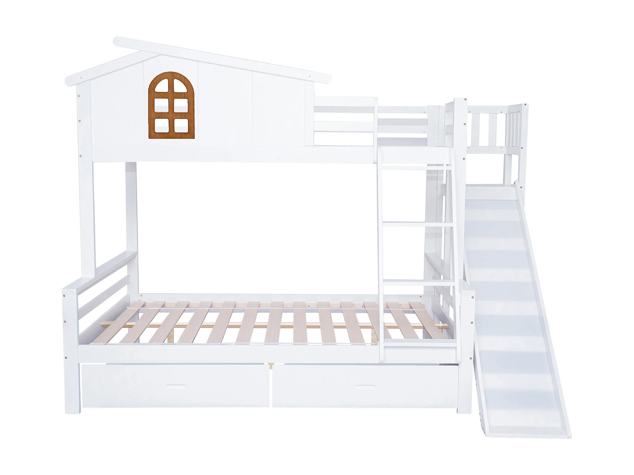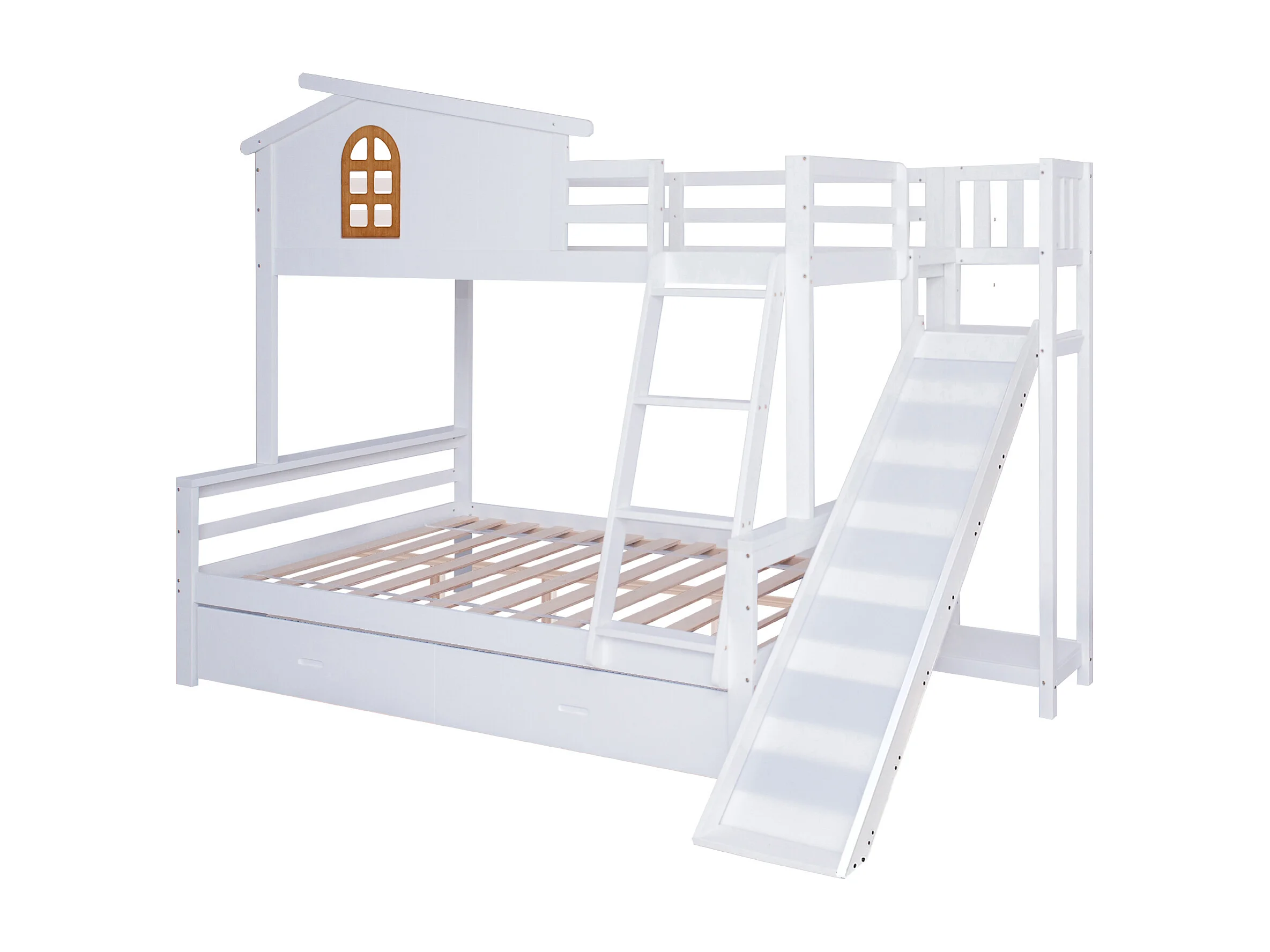 Beliche branco para criança 90x200cm e adulto 120x200cm com 2 gavetas, escorrega e escada, sem colchão