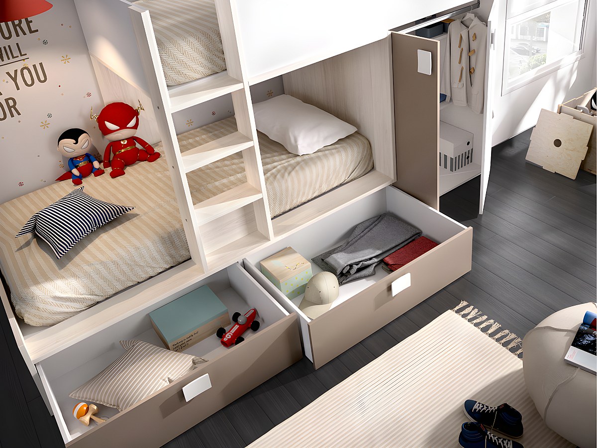 Liberto o espaço no quarto dos seus filhos graças ao beliche JUANITO. O seu armário e as suas 2 grandes gavetas permitir-lhe-ão arrumar todas as suas coisas.