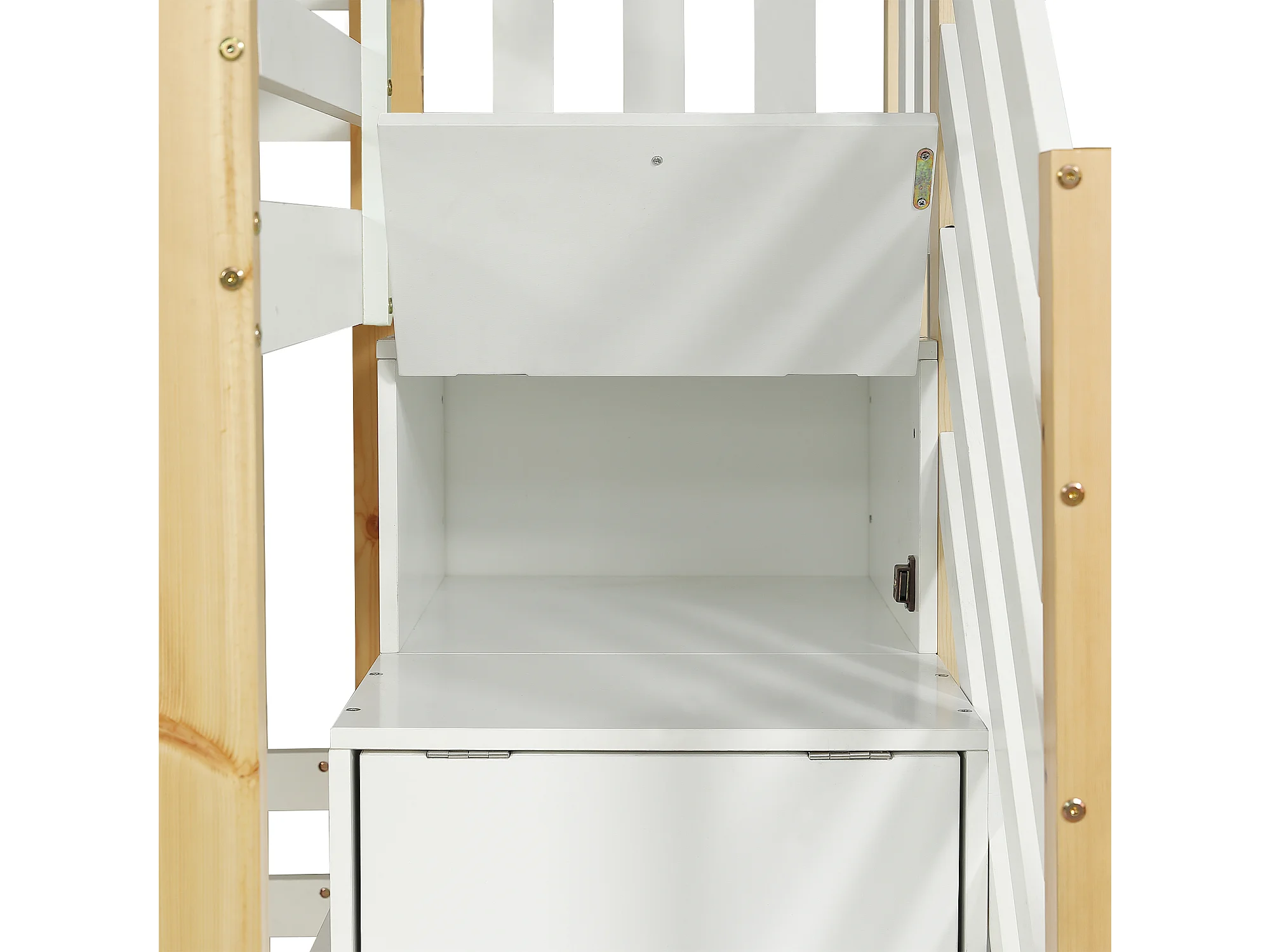 Beliche estilo cabine branca de 90x200cm com escada de arrumação, grades de segurança e janelas – Cama infantil robusta e leve, feita de pinho e MDF.
