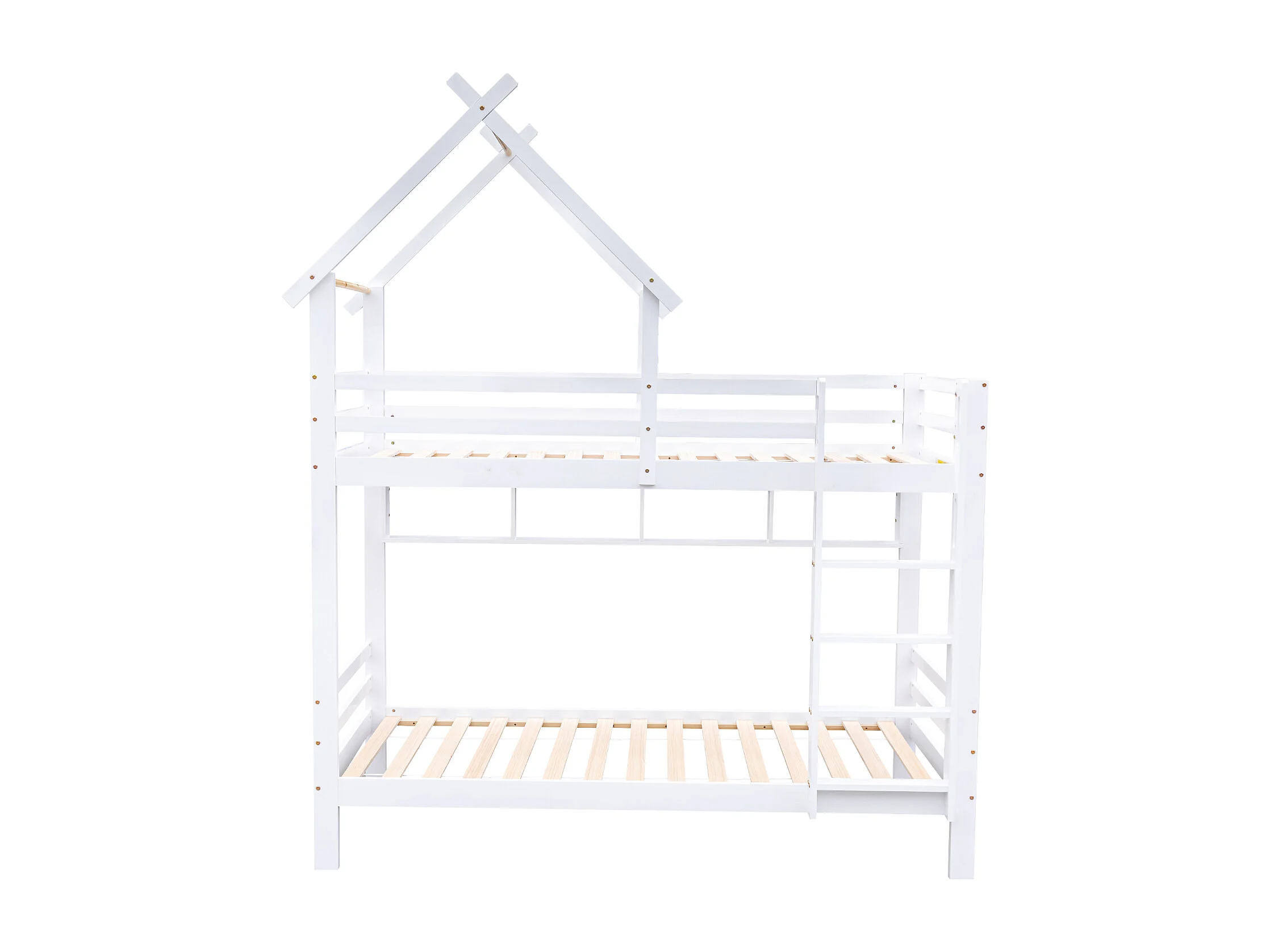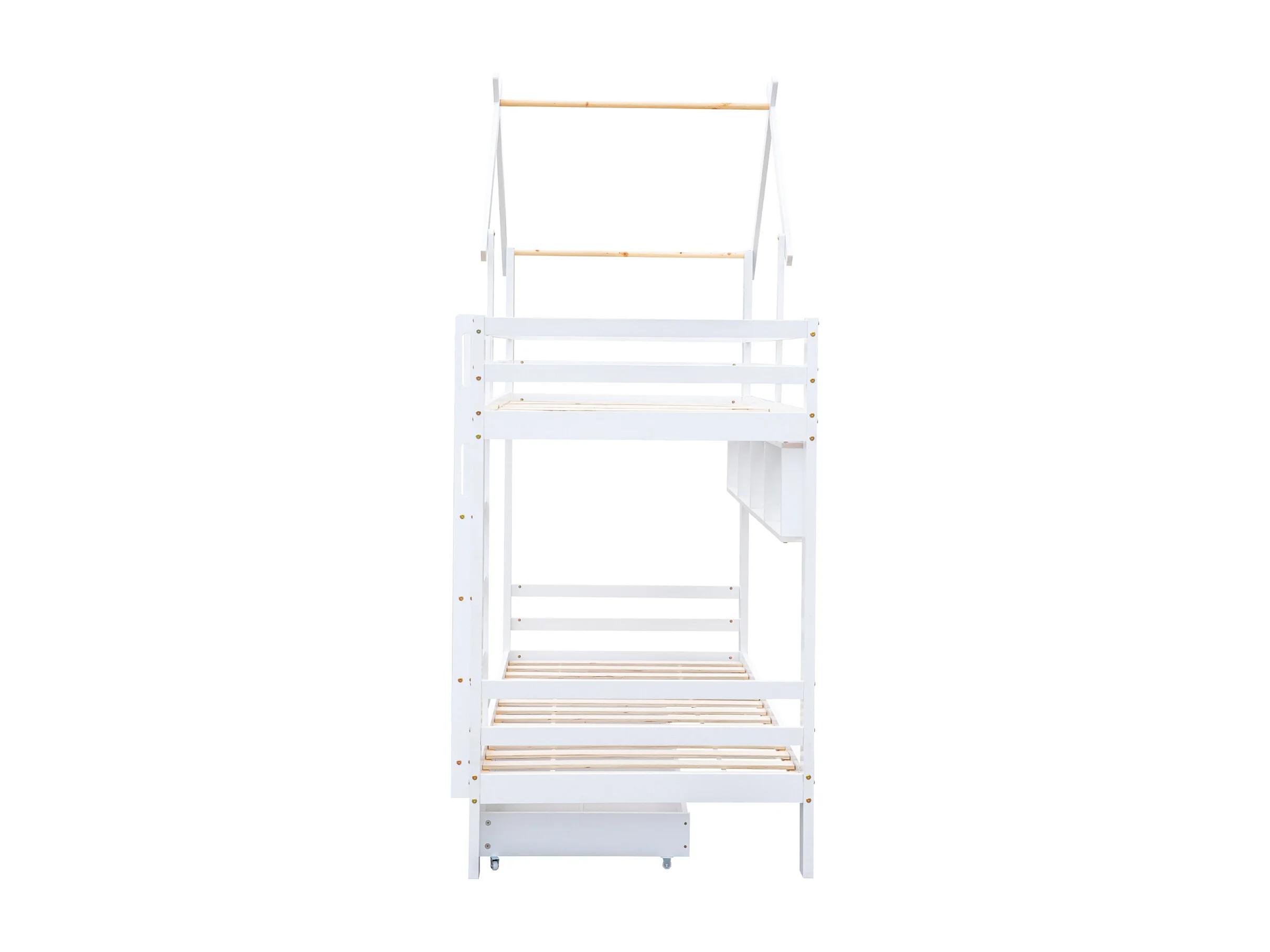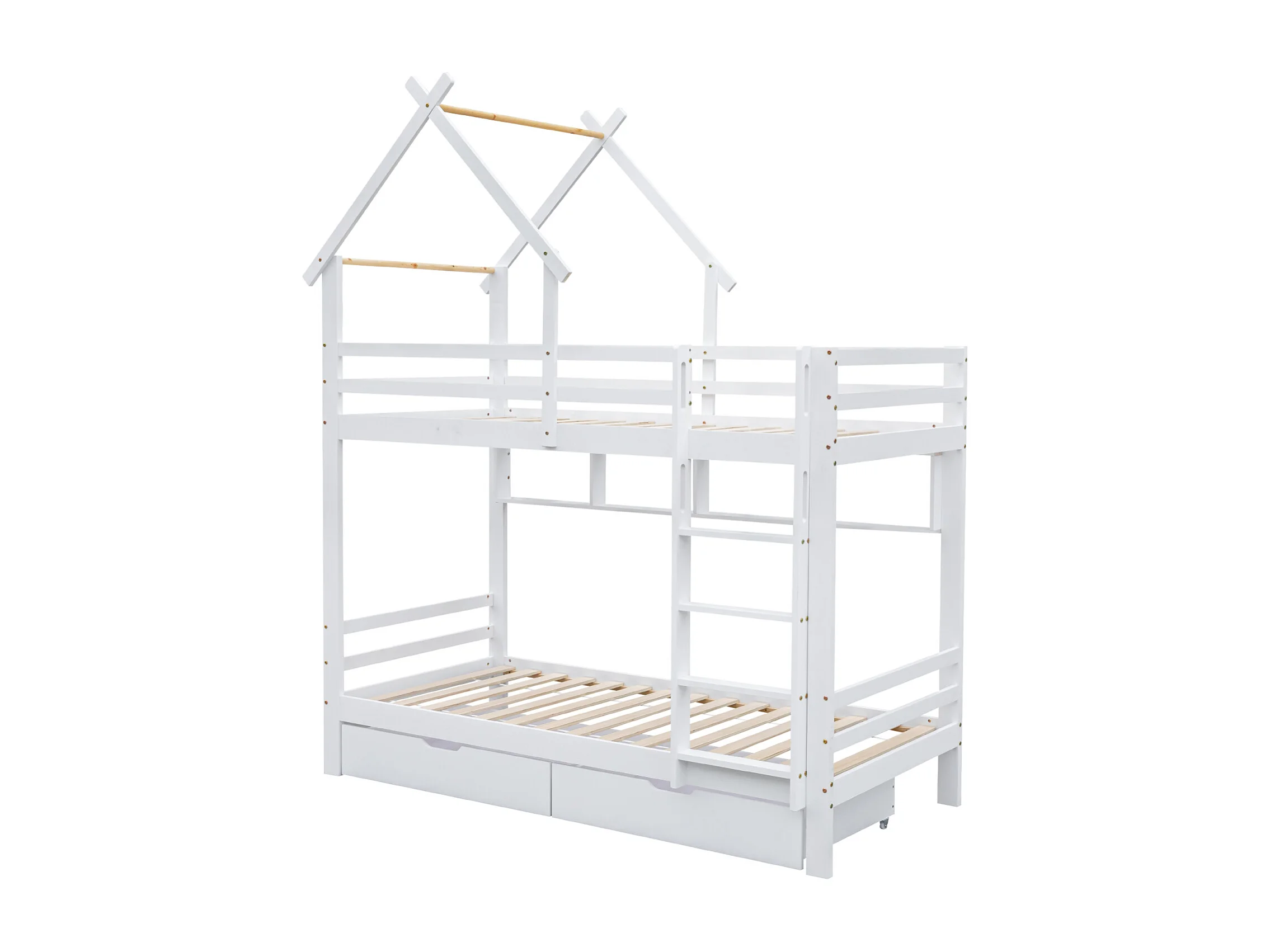 Beliche com escada de armazenamento, cama de casa, cama de criança, com portão de segurança, com janela e teto, pinho+MDF, branco+natural, 90x200cm