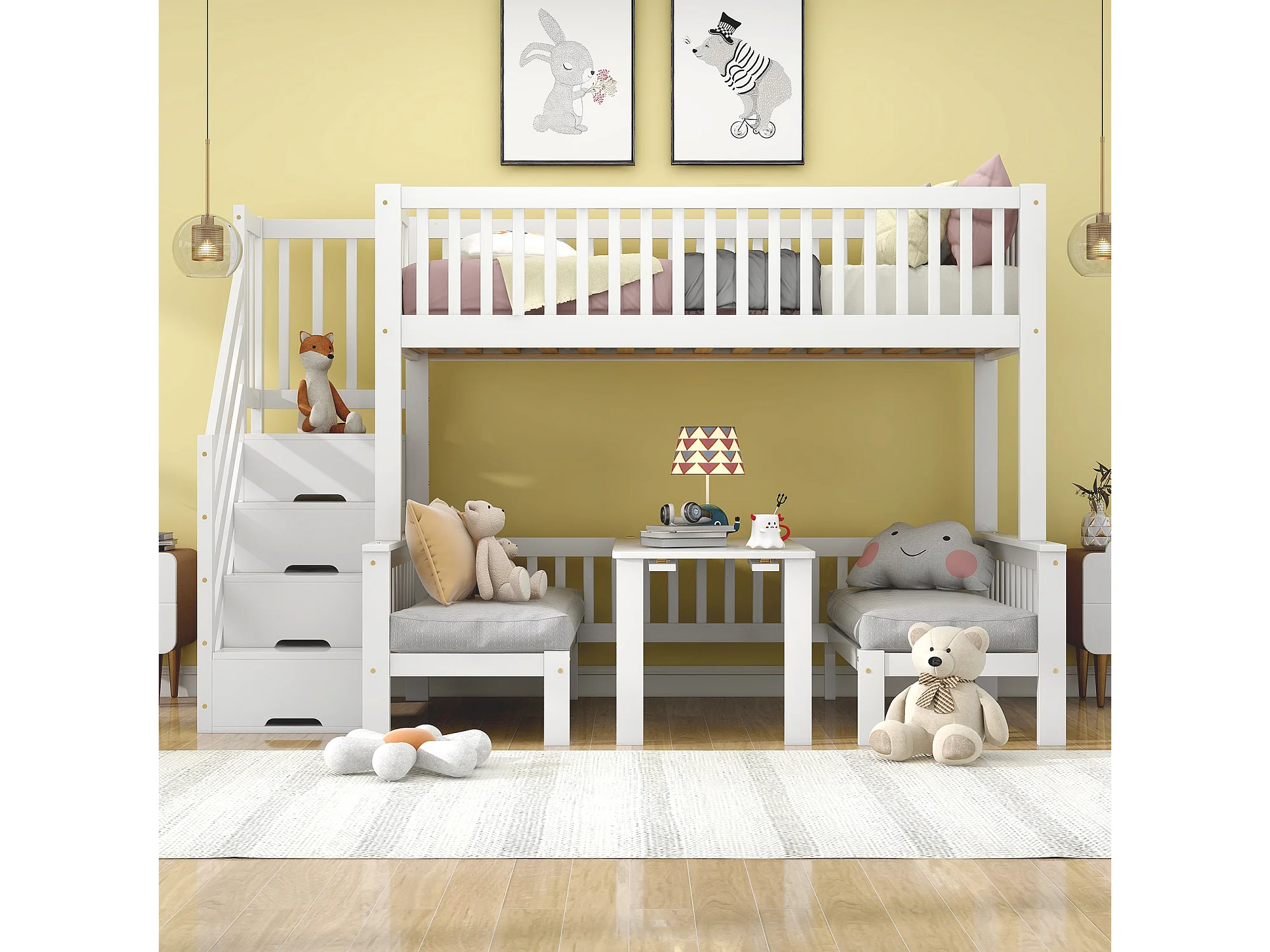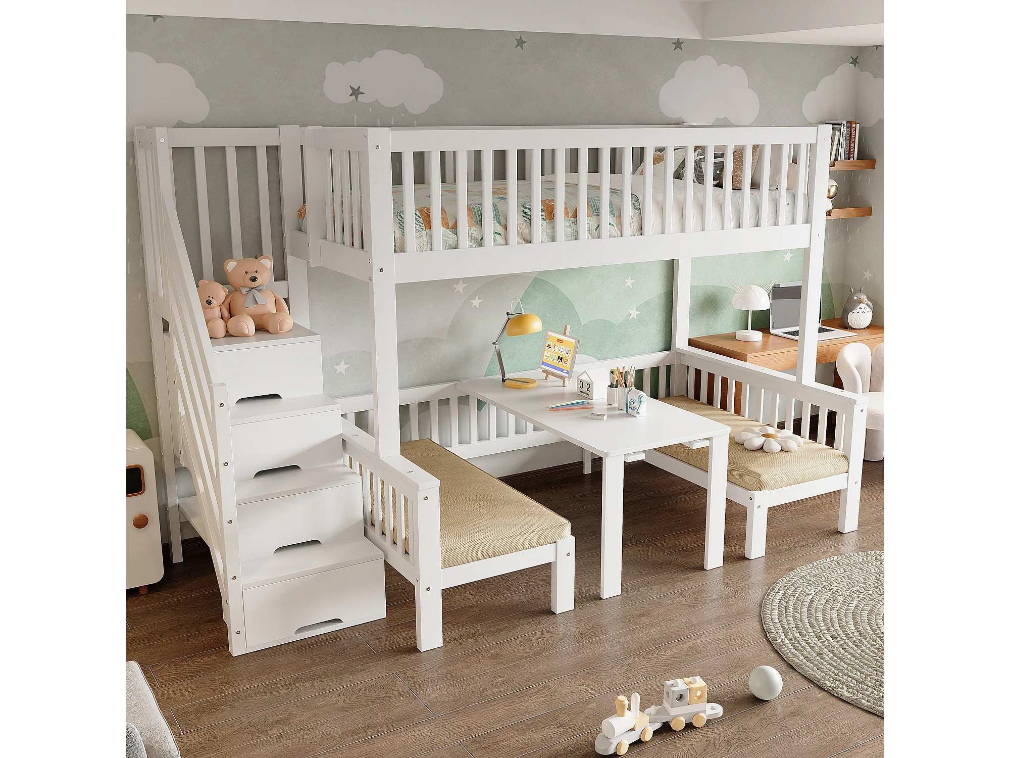 Beliche infantil - 90 x 200 + 120 x 200 cm - com mesa ajustável + escada com espaço para armazenamento - pinho + MDF - branco