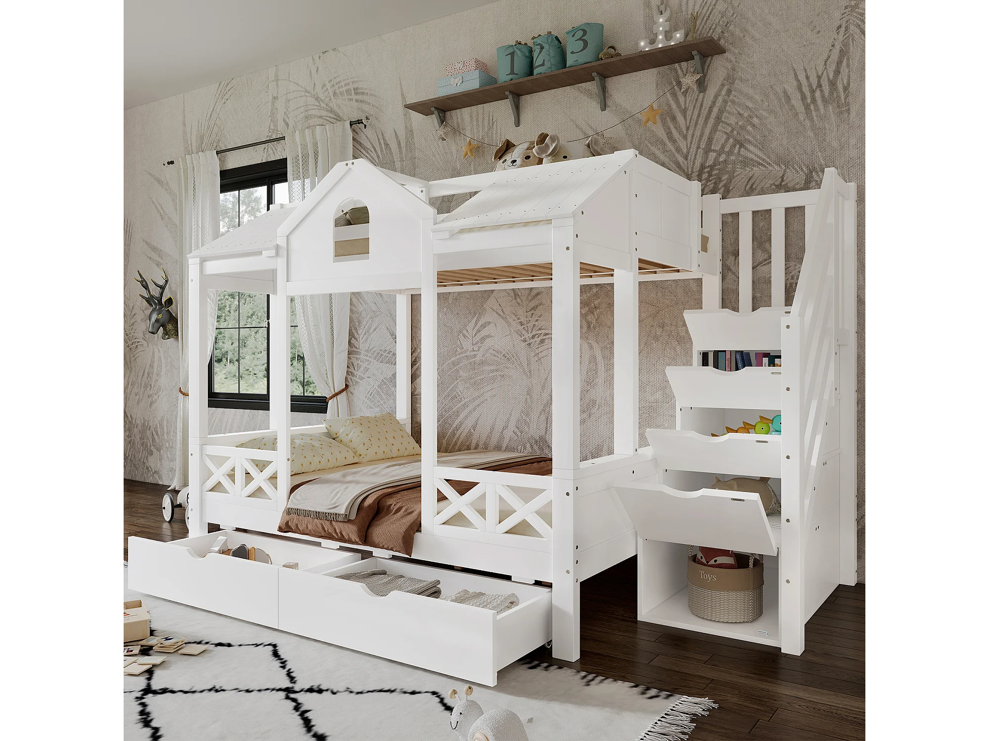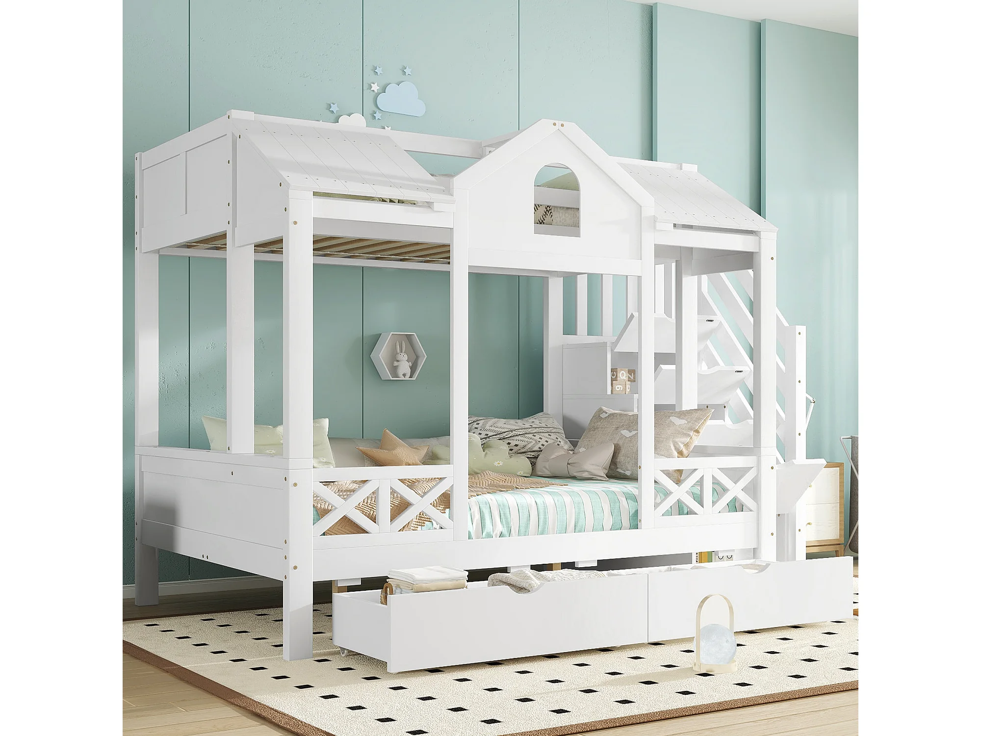 Beliche 90x200cm + 140x200cm - com 2 gavetas - com balaústres e janelas - escada com armazenamento - Branco (sem colchão)