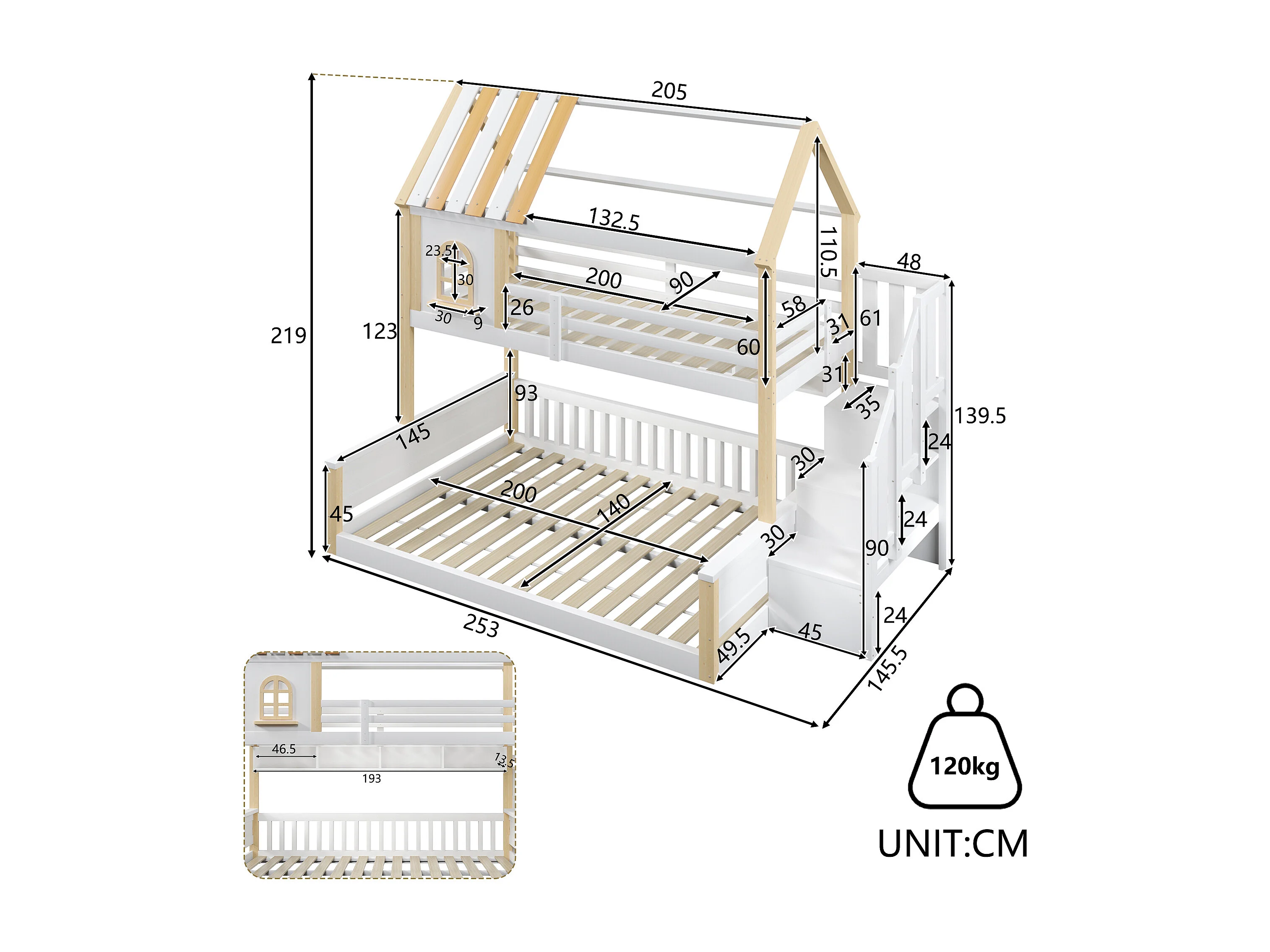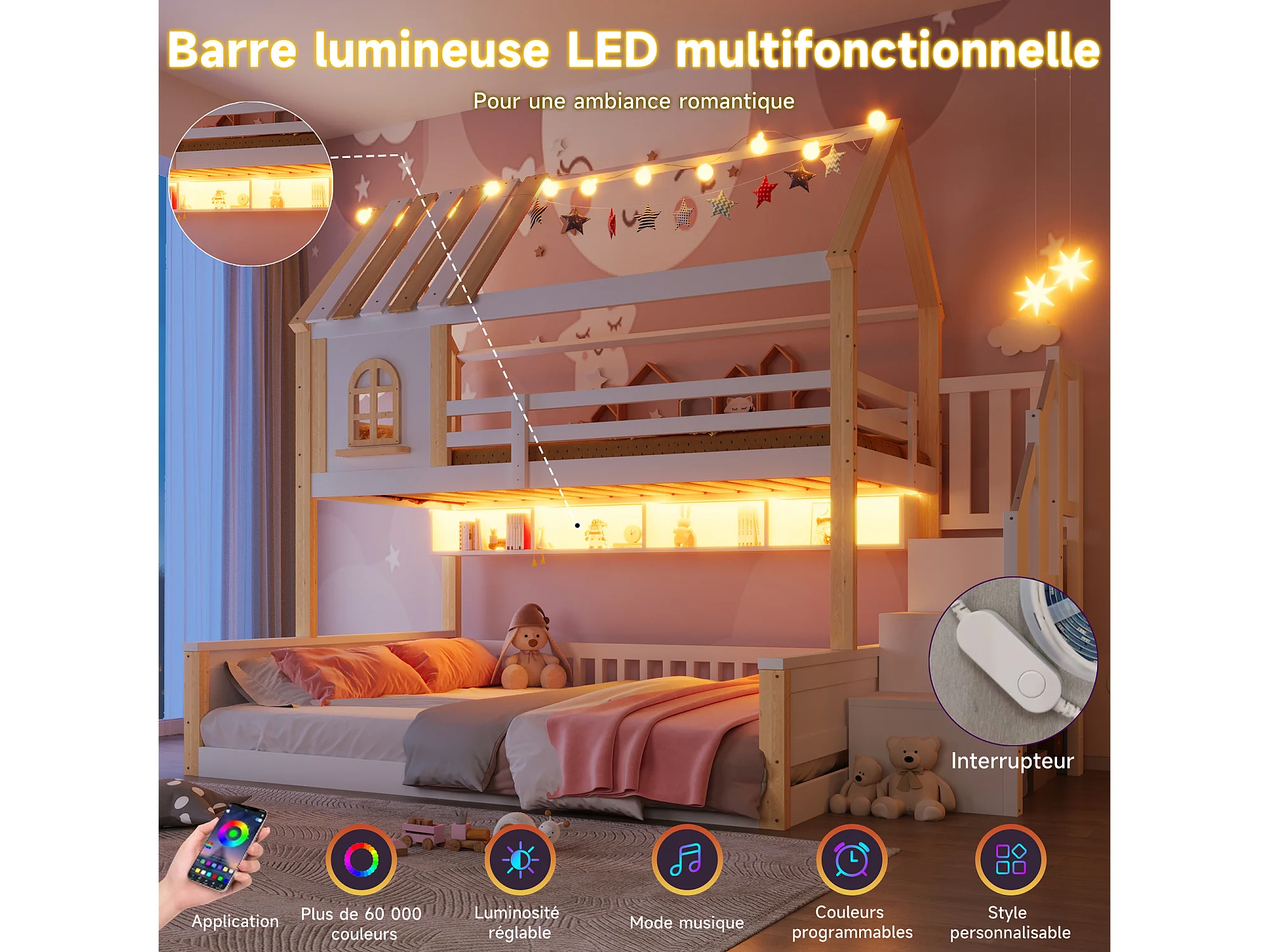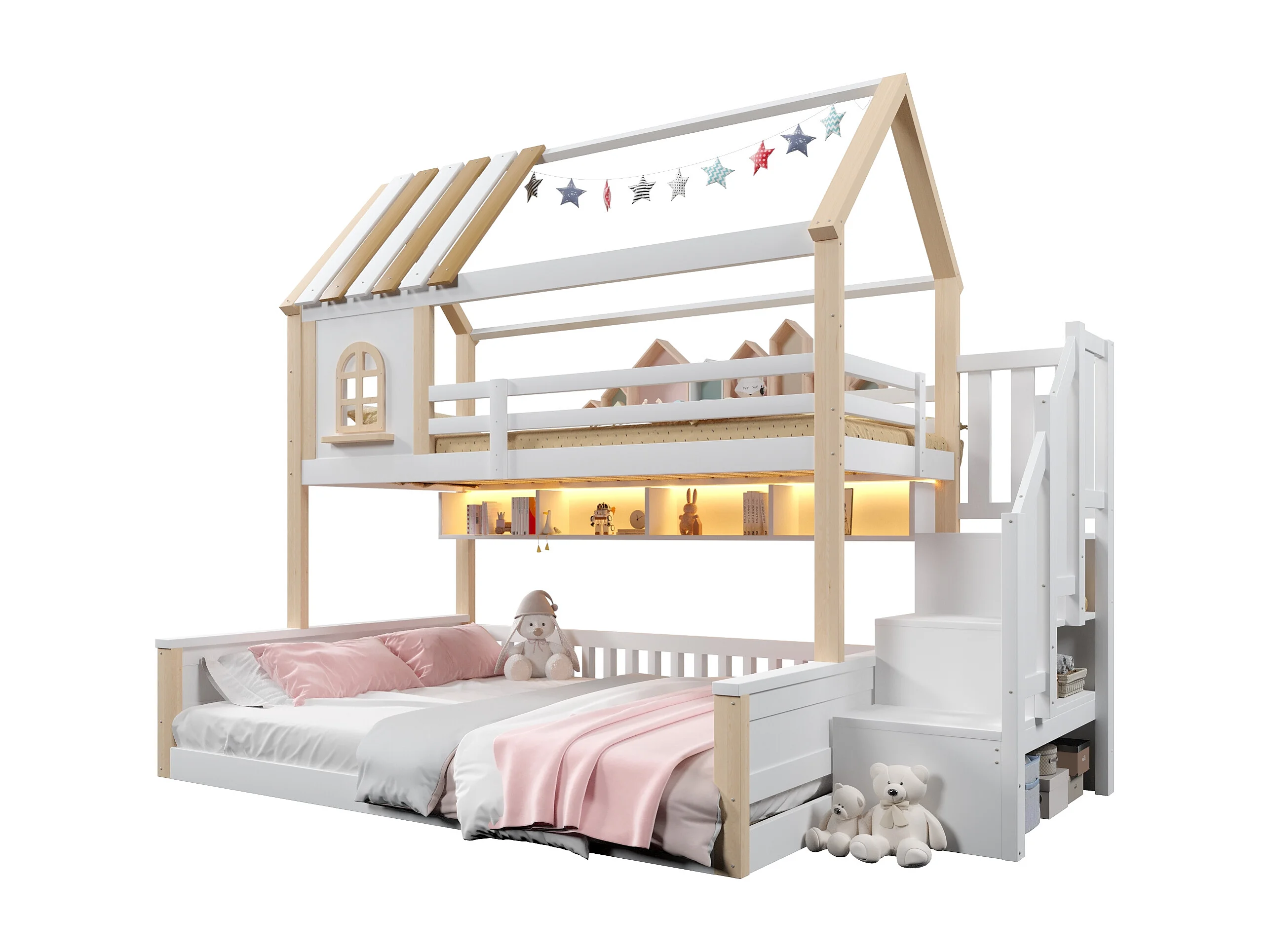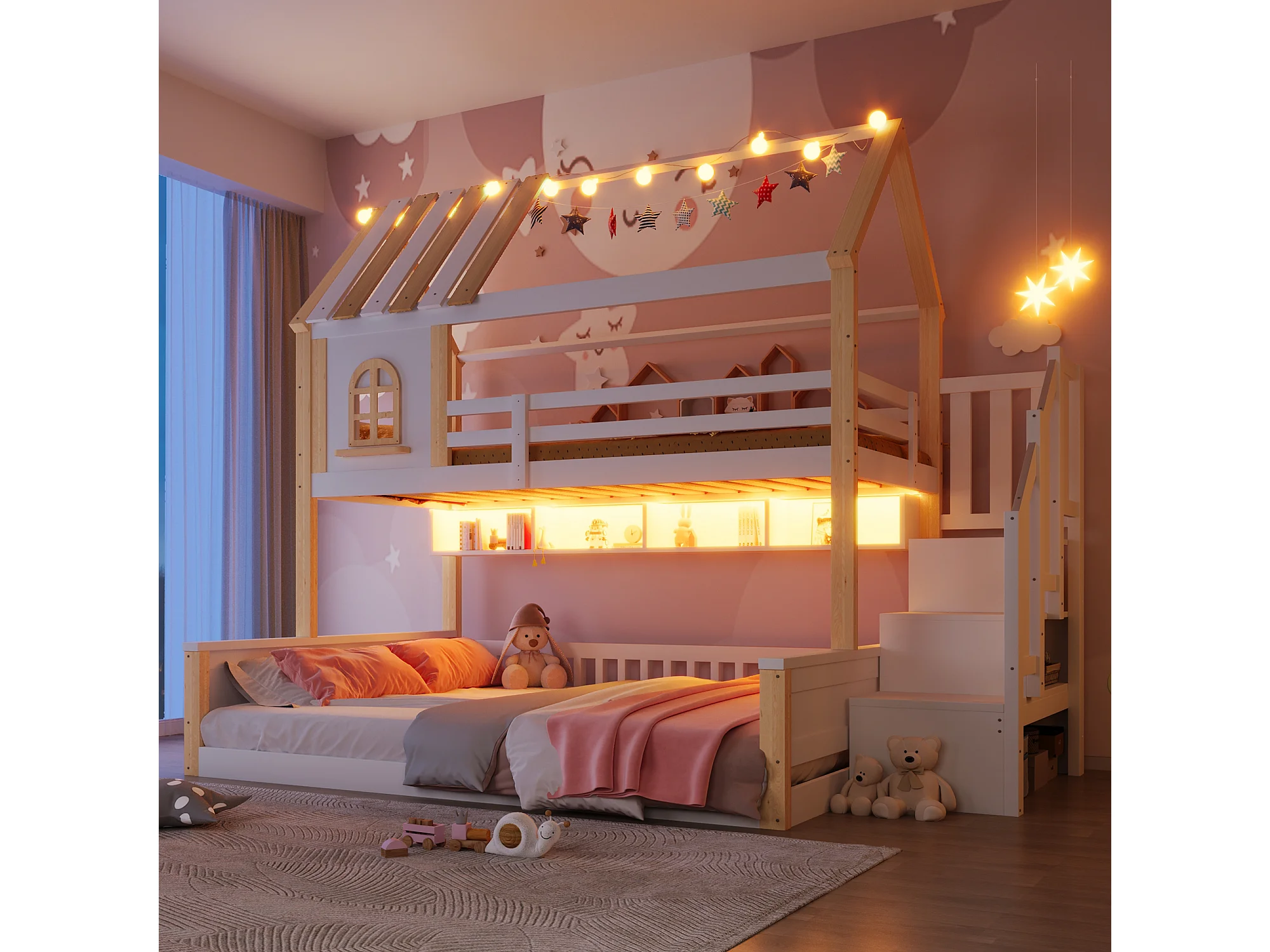 Beliche infantil - 90 x 200 cm + 140 x 200 cm - com LEDs + prateleiras + escada de arrumação - design para casa - madeira - branco e natural