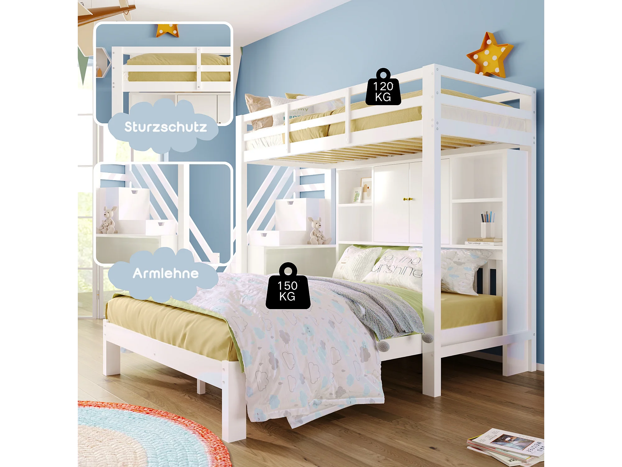 Beliche infantil 90x200 cm + 140x200 cm - com escada de arrumação e secretária amovível - em madeira maciça e MDF - Branco