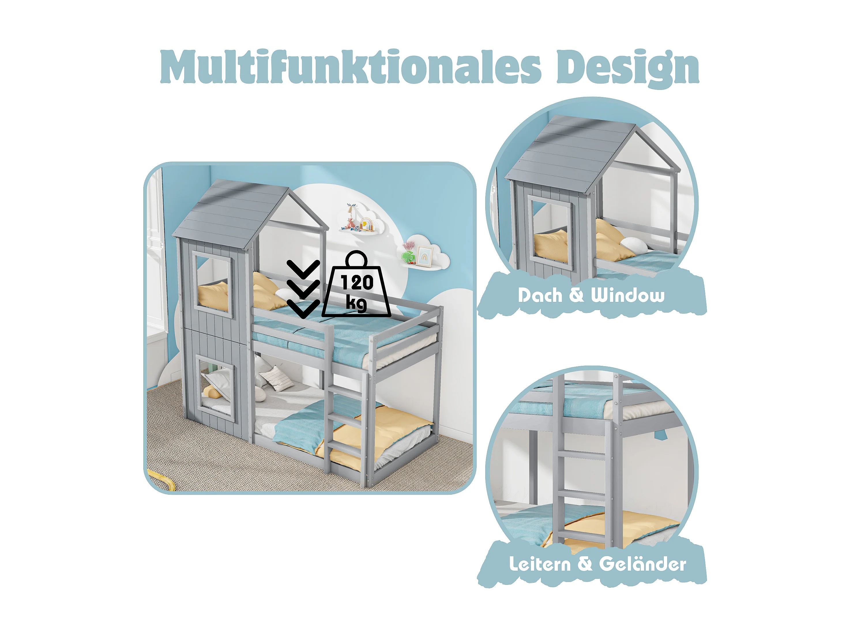 Beliche infantil 90×200 cm em madeira maciça com escada e dossel, cinza