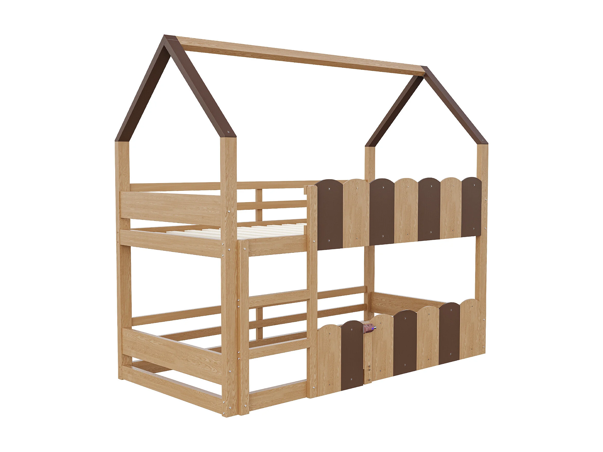 Beliche infantil 90x200 cm na cor madeira com grades de segurança – estrado de ripas para a cama superior, para meninos e meninas.