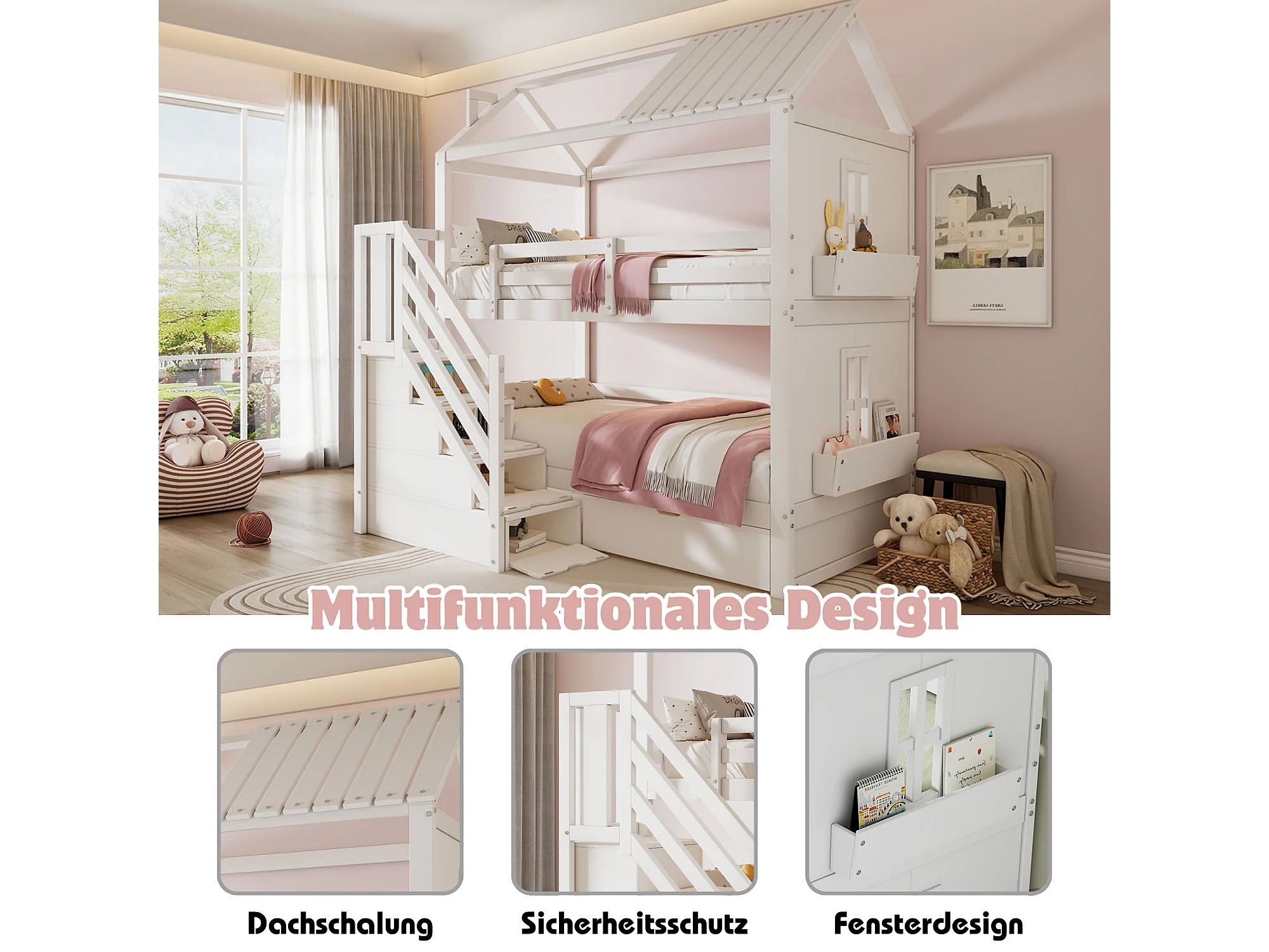 Beliche infantil 90x200 madeira maciça com gavetas e prateleiras brancas