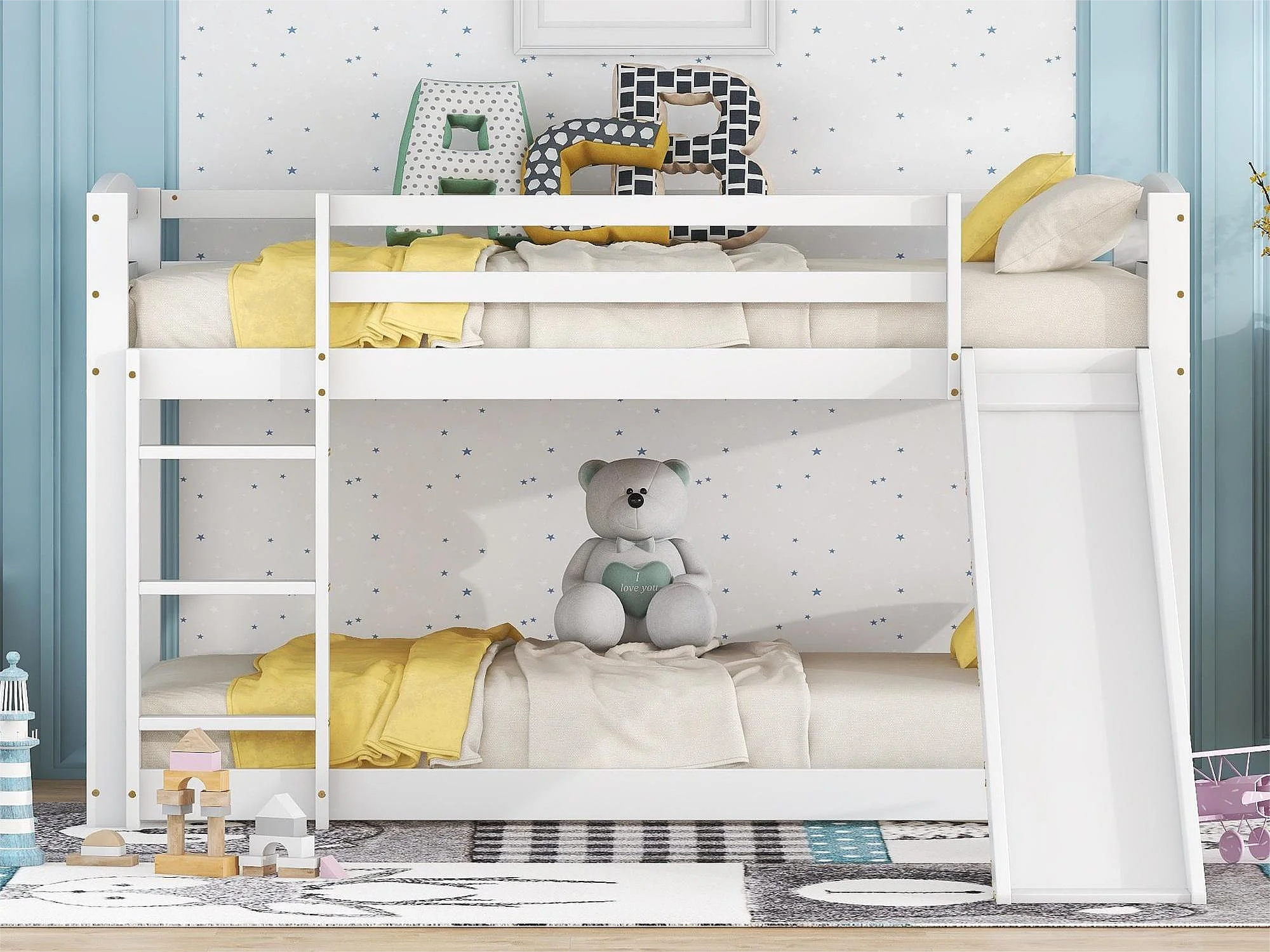 Beliches para 2 pessoas, 2x90x200cm com escorregador e guarda-corpo, Estrutura em pinho, Base de ripas incluída, Branco
