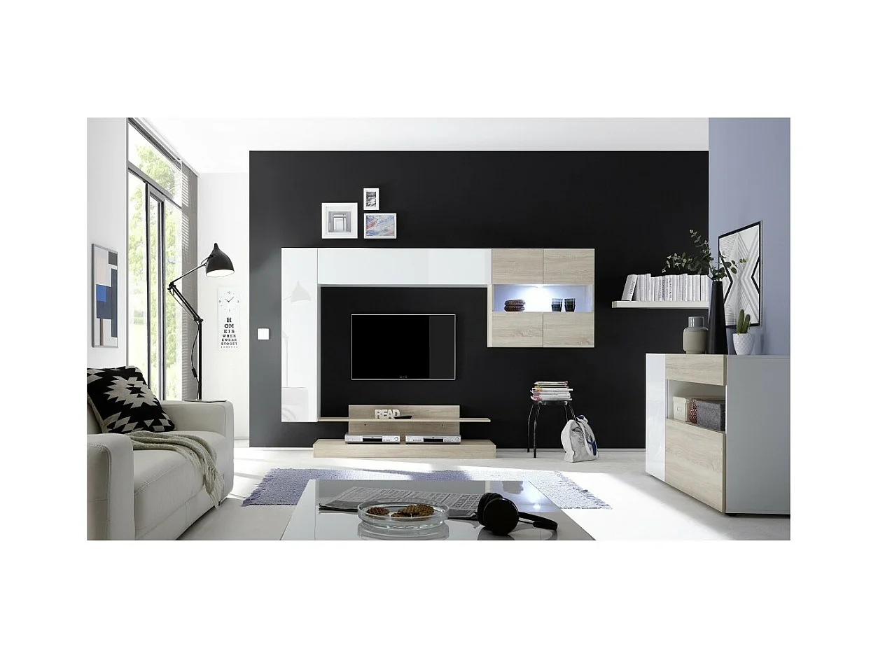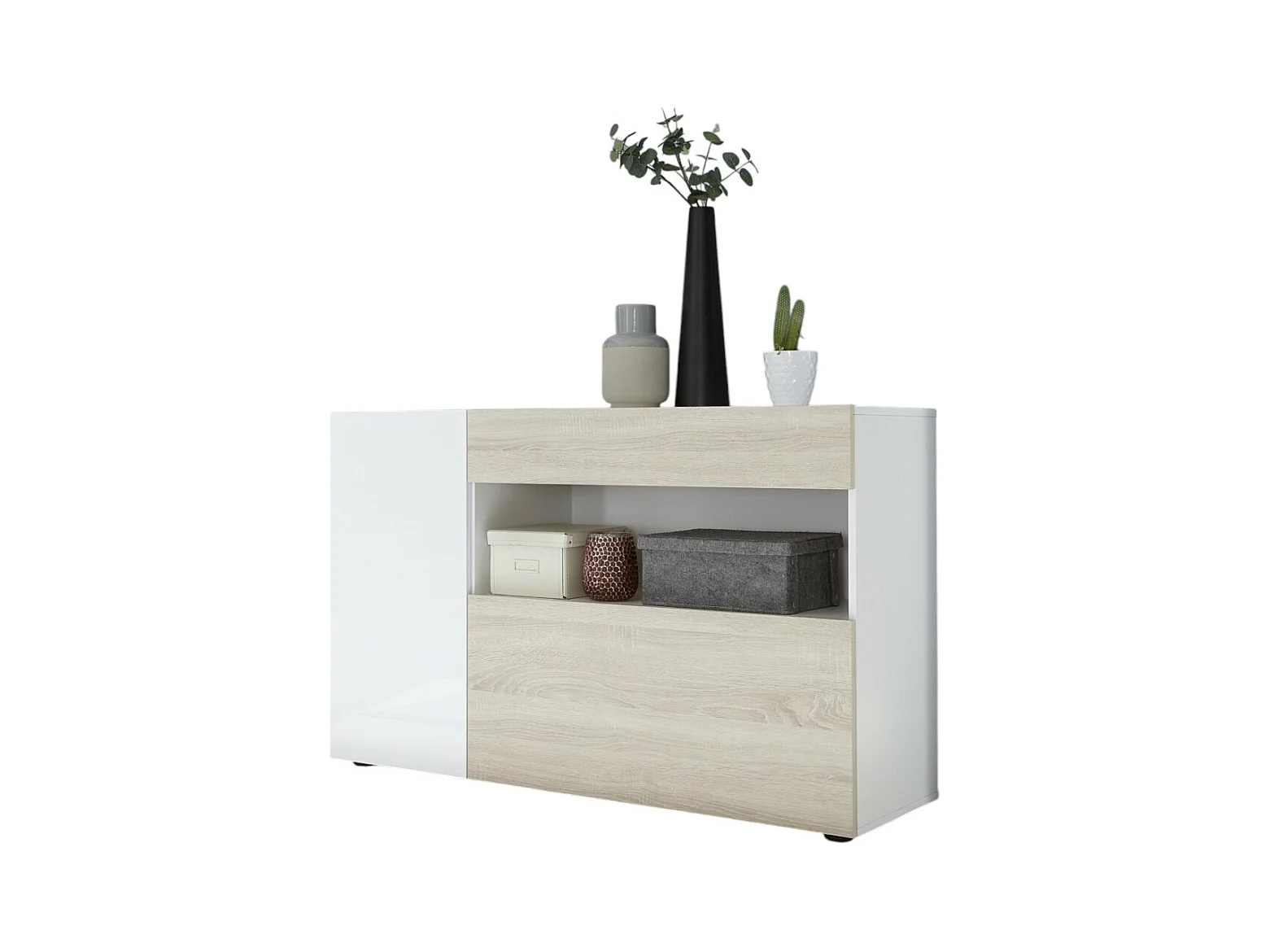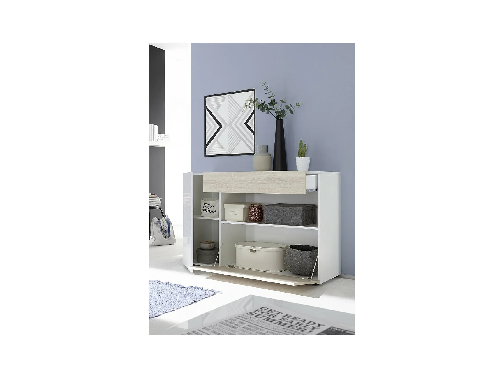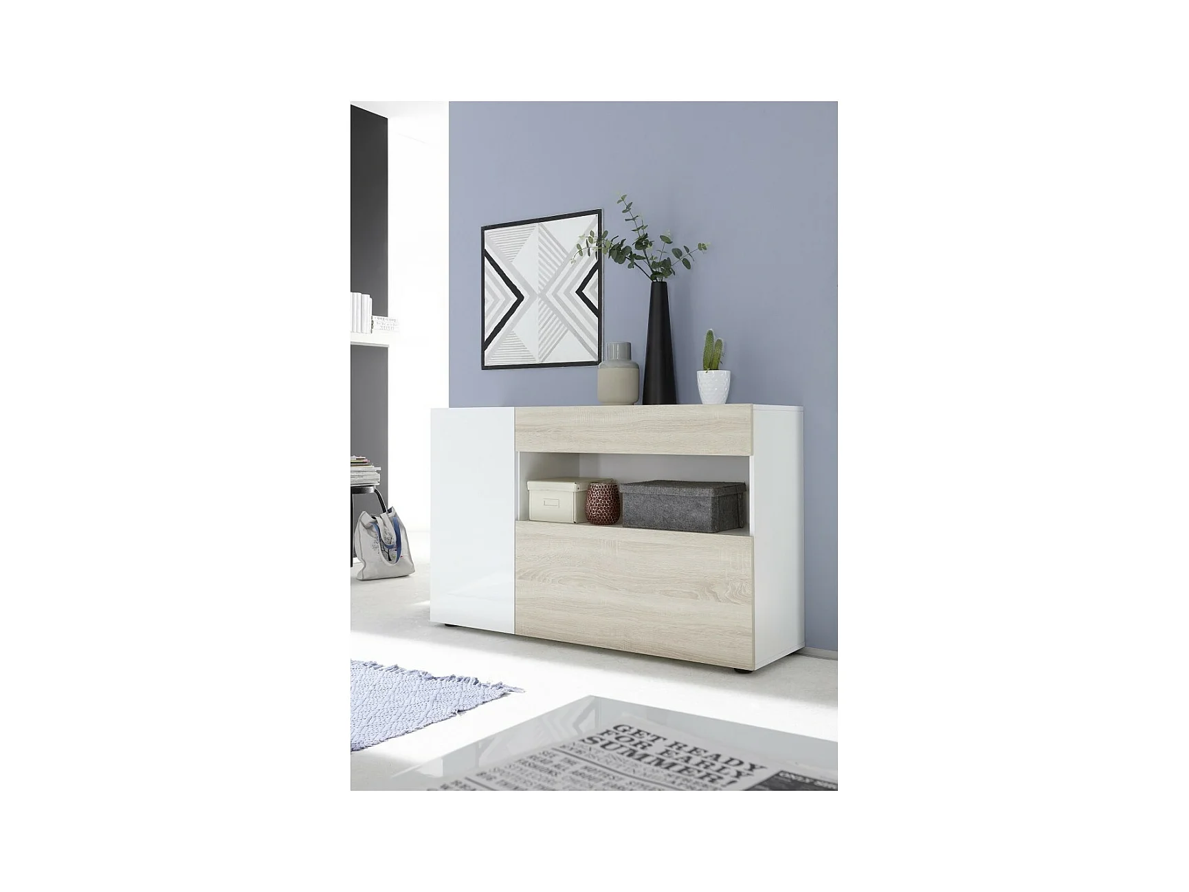 Buffet 1 gaveta e 2 portas, coleção KALO, cores branco e carvalho claro, ideal para sua sala de estar.