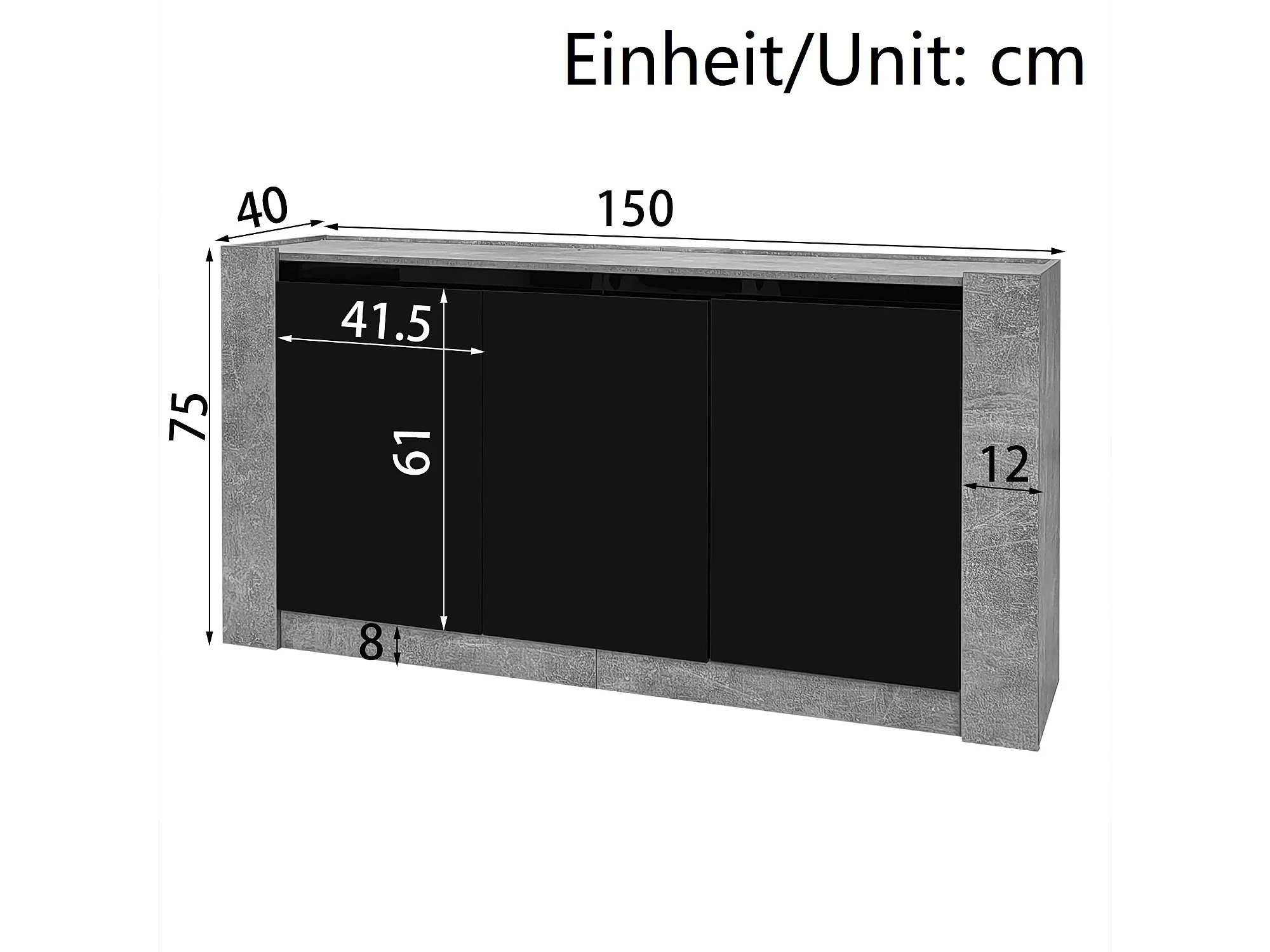 Buffet 150x40x75 cm - 3 portas - sem puxadores - com prateleiras ajustáveis - preto + cinza