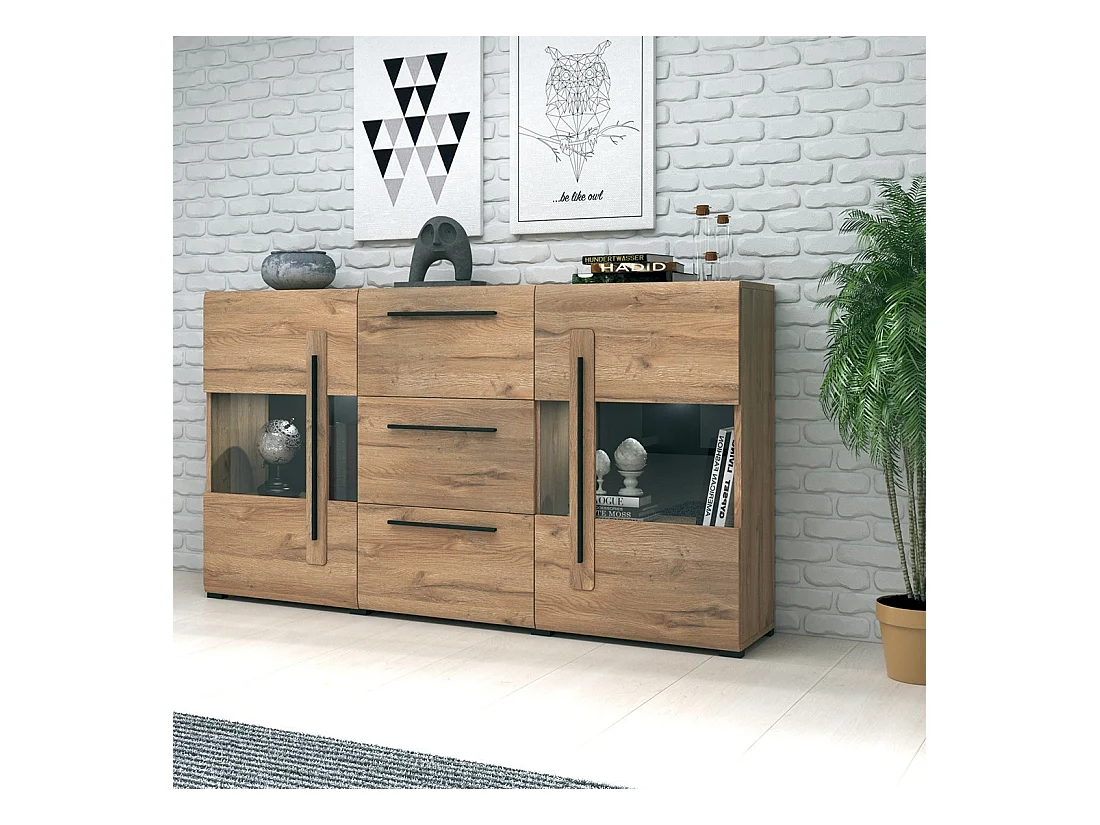 Buffet coloris chêne et noir 180cm collection HAVANA. Bahut design avec 3 portes et 3 tiroirs.