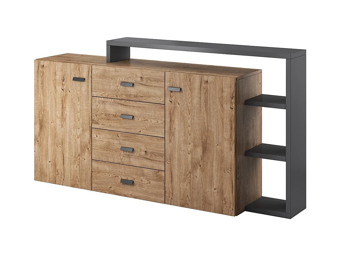 Buffet design de 155cm para sala de estar na cor carvalho e preto com efeito madeira da coleção SANTIAGO.