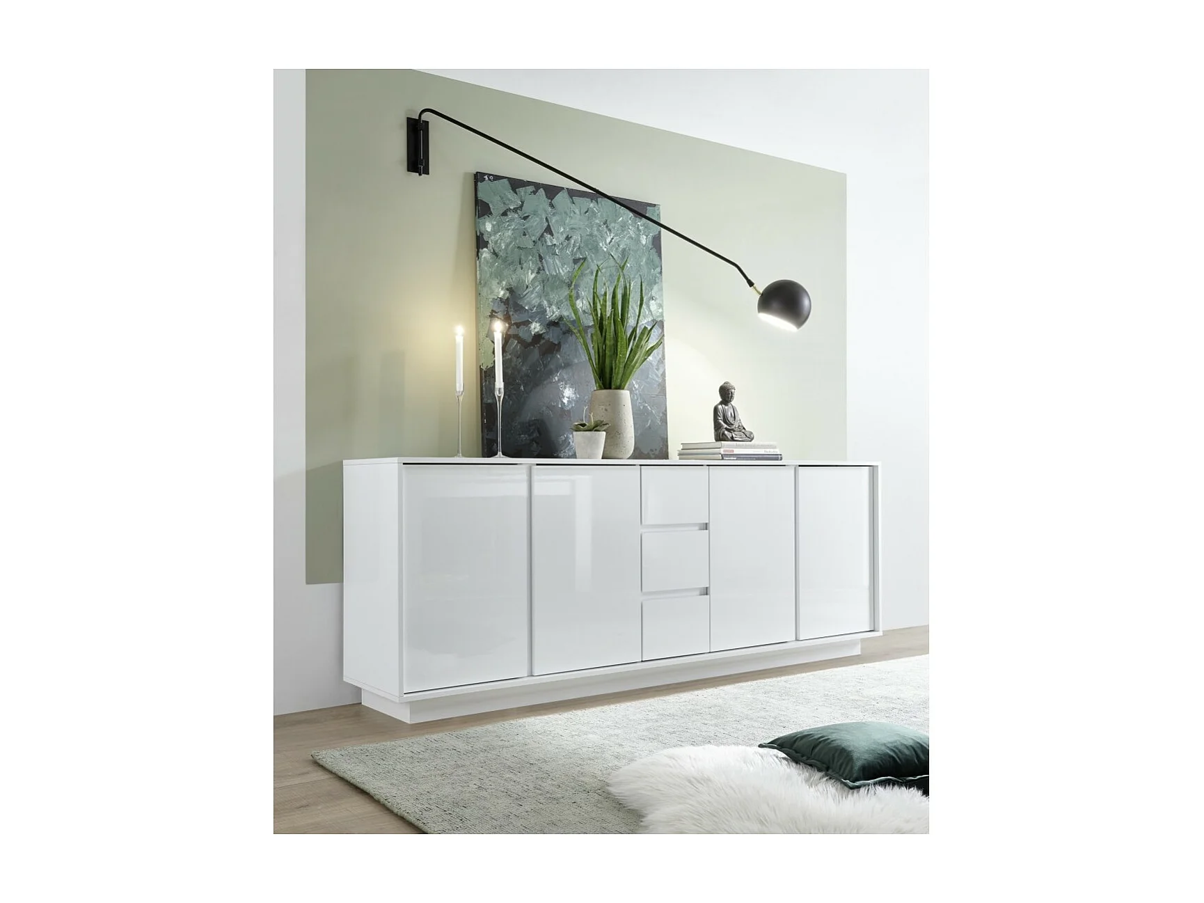 Buffet de 4 portas e 3 gavetas, coleção CREAM, na cor branco brilhante laqueado, ideal para uma sala de estar ou sala de jantar moderna.