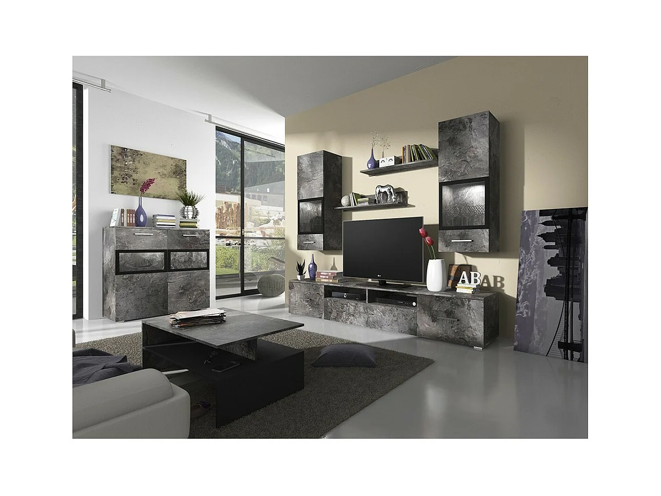 Buffet de 180cm para sala de estar na cor cinza com efeito de ardósia e iluminação LED multicolorida integrada, coleção BOMBAY.