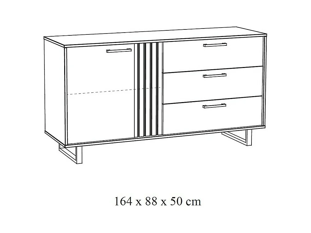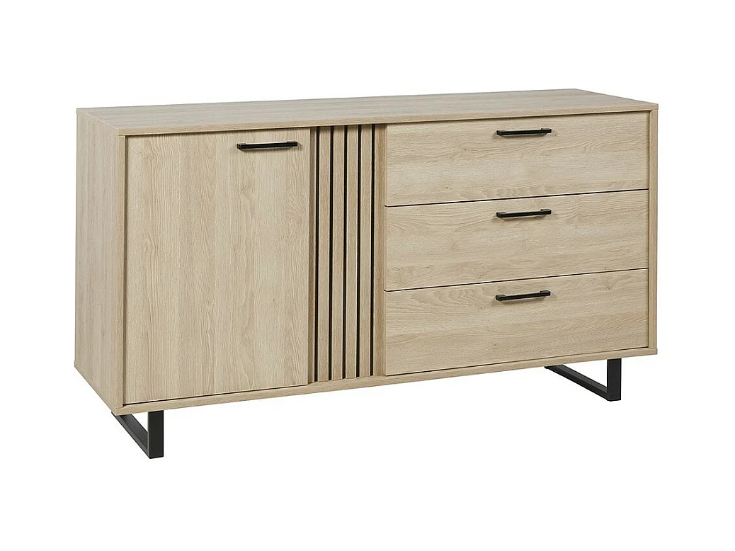 Buffet design de 165cm com 1 porta e 3 gavetas para sala na cor carvalho claro, coleção LOFT com pés de metal.