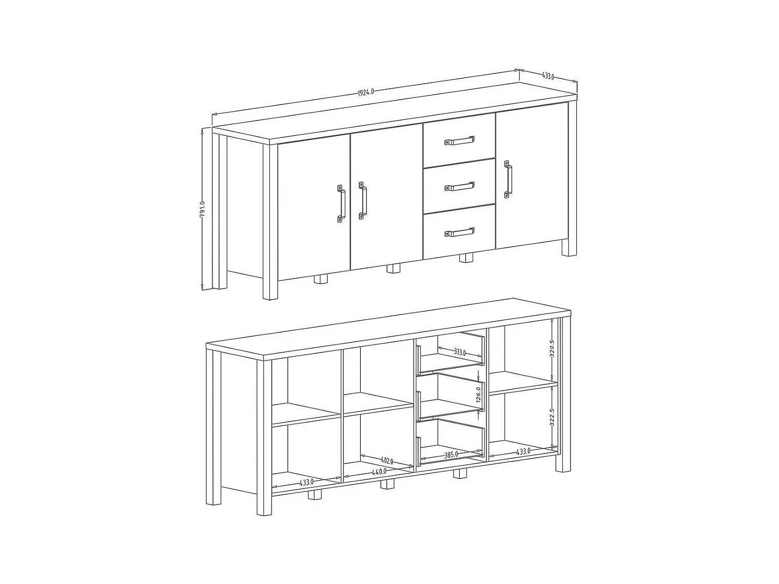 Buffet alto coleção DARWIN. Cor pinheiro e preto. 3 portas e 3 gavetas.
