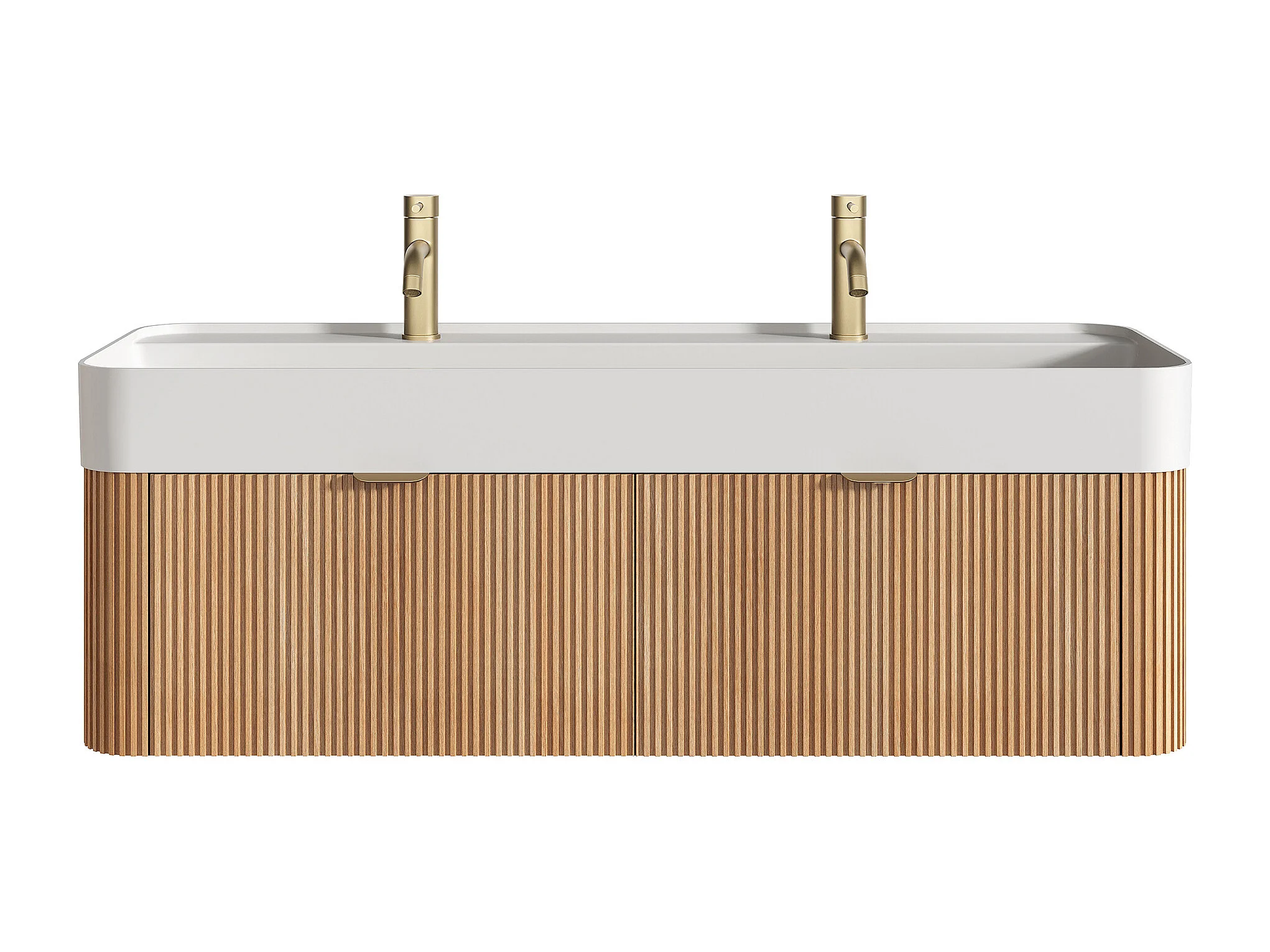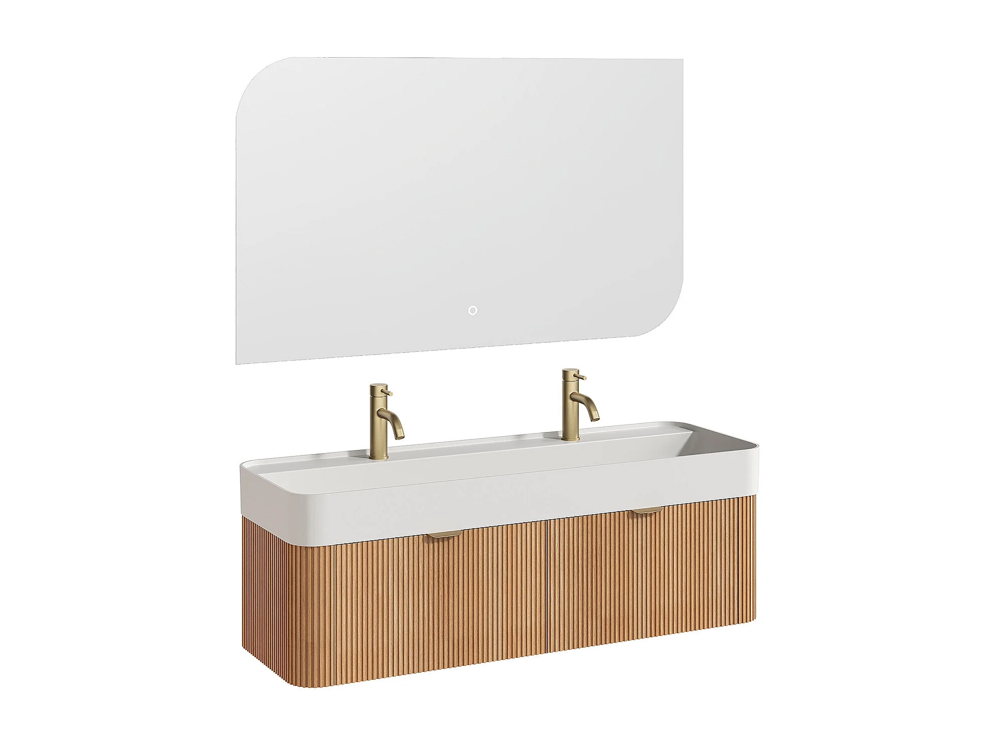 Móvel de casa de banho suspenso estriado em madeira de freixo com lavatório duplo para encastrar, torneira e espelho - Natural claro - 120 cm - BULMAS