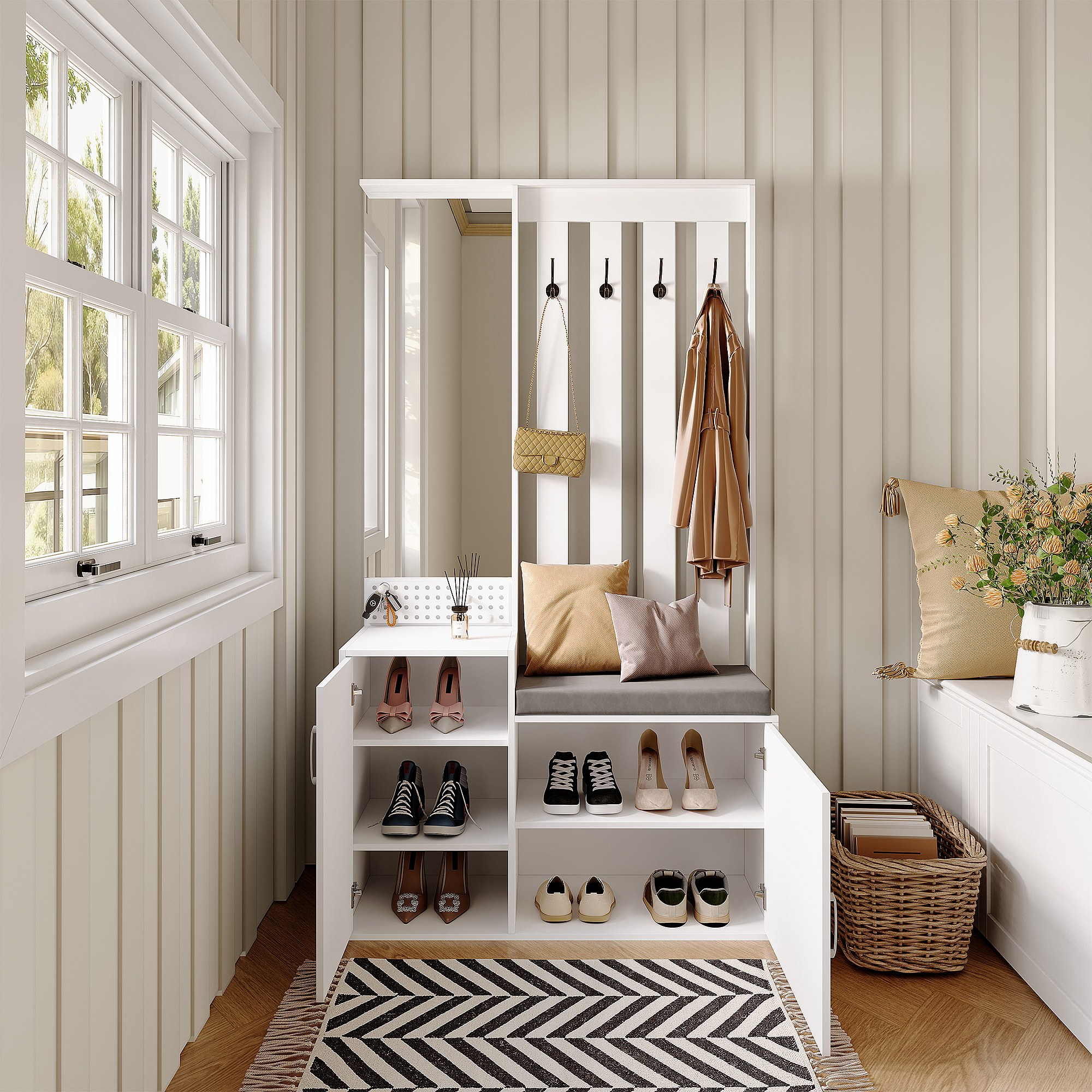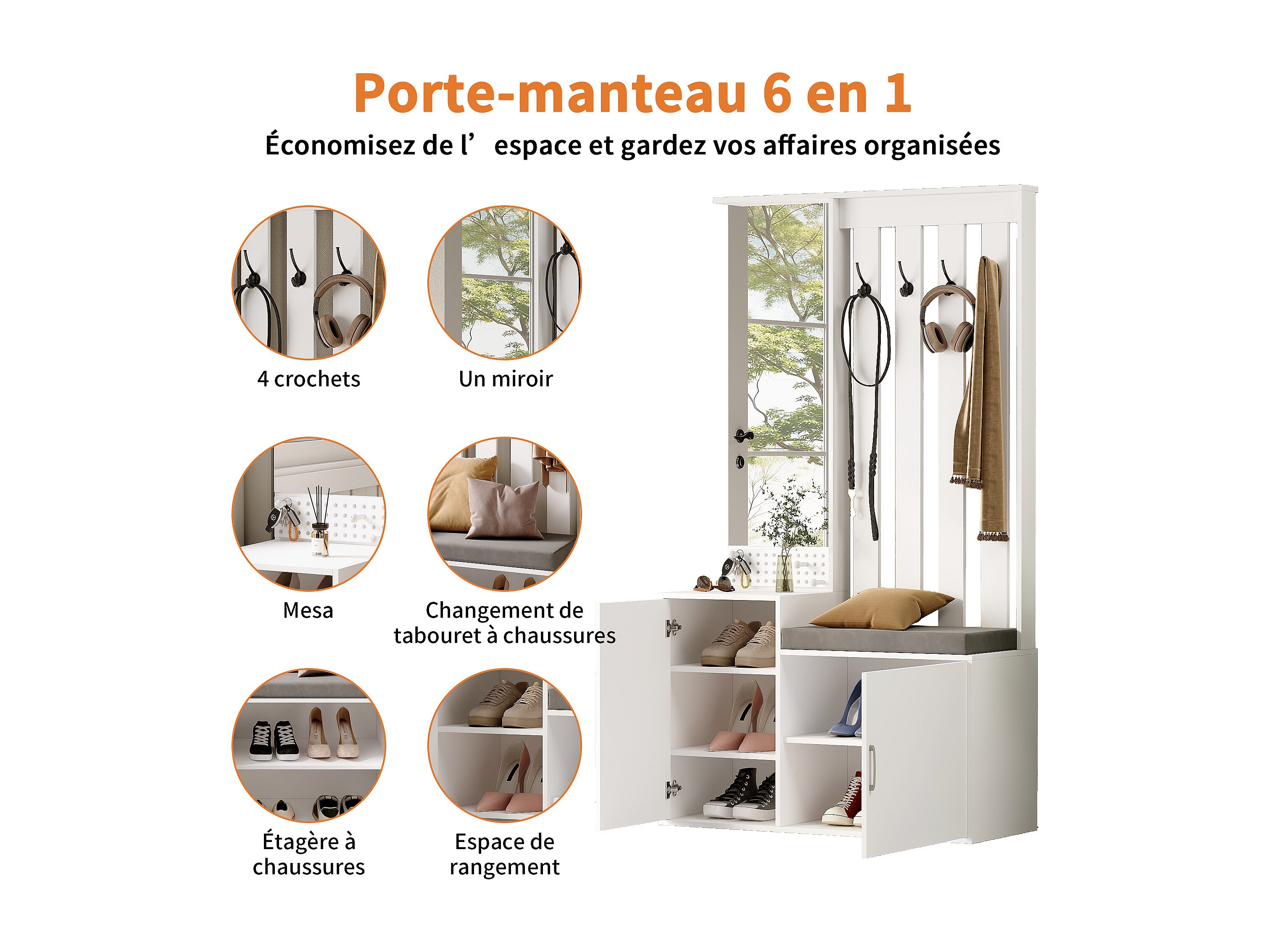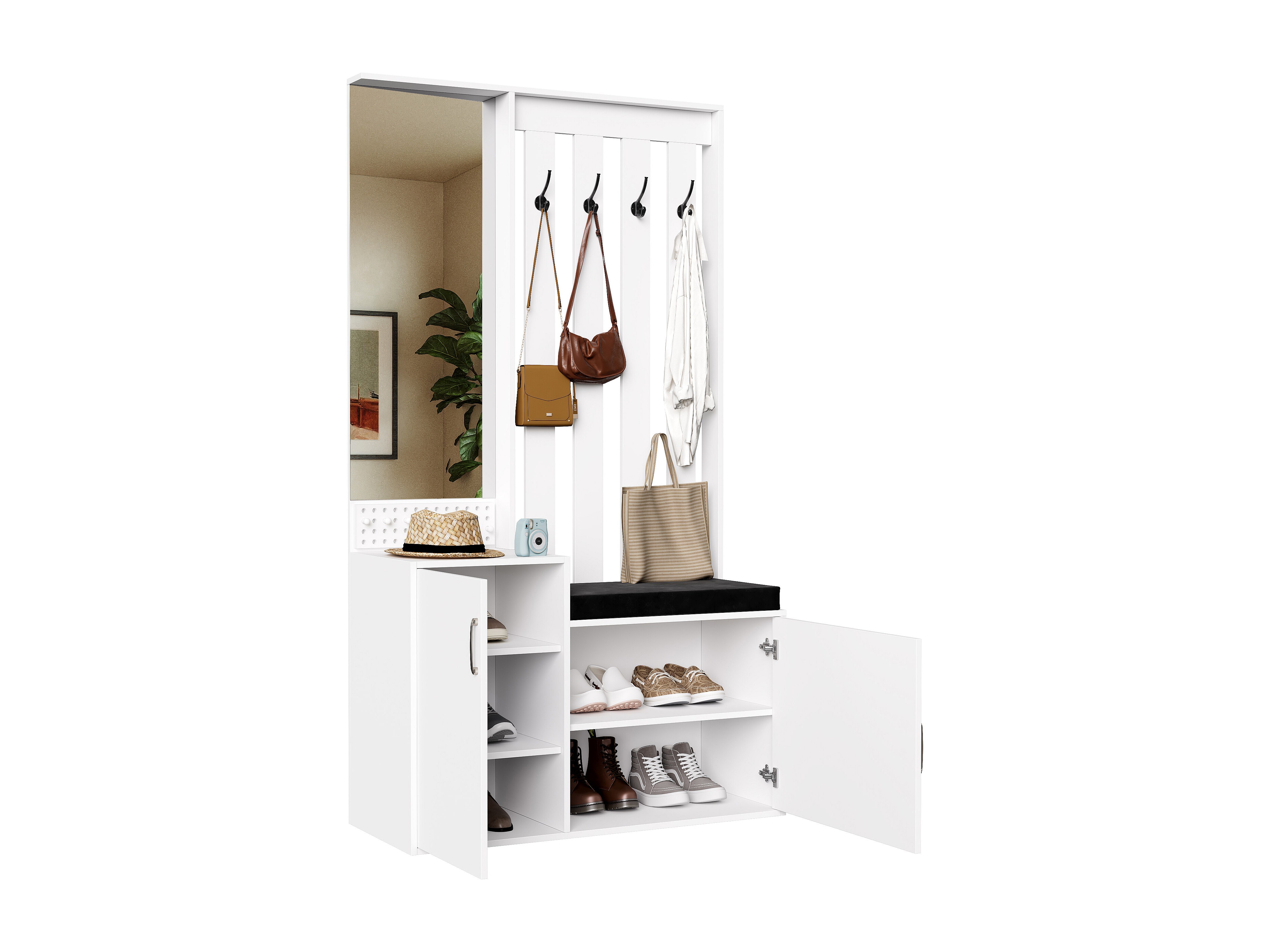 Cabide 6 em 1 com Espelho, Banco Estofado, Sapateira e Ganchos – Branco Moderno