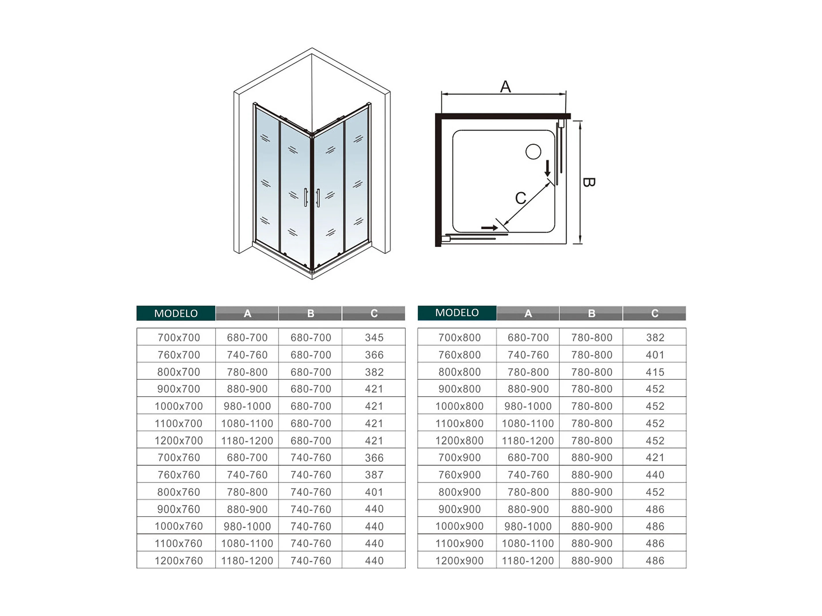Cabine de duche quadrada correr Perfil cromado Vidro Anticalcário 6mm (680-700)x(680-700)x1950mm-AICA