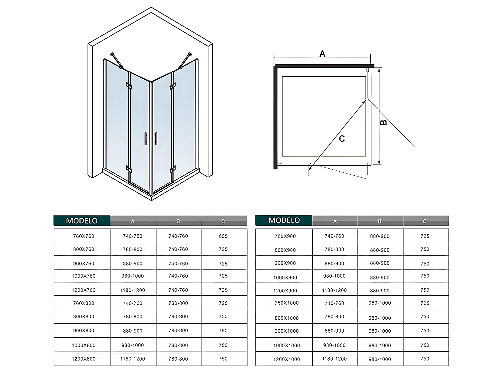 Cabine de duche rectangular Bater Perfil cromado Vidro Anticalcário 6mm (1080-1100)x(880-900)x1900mm-AICA