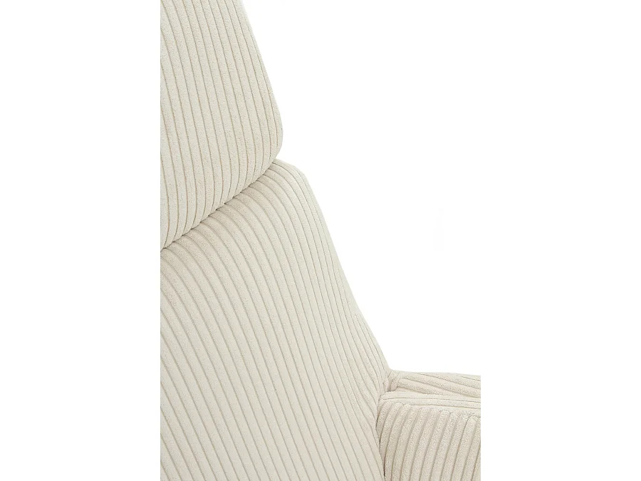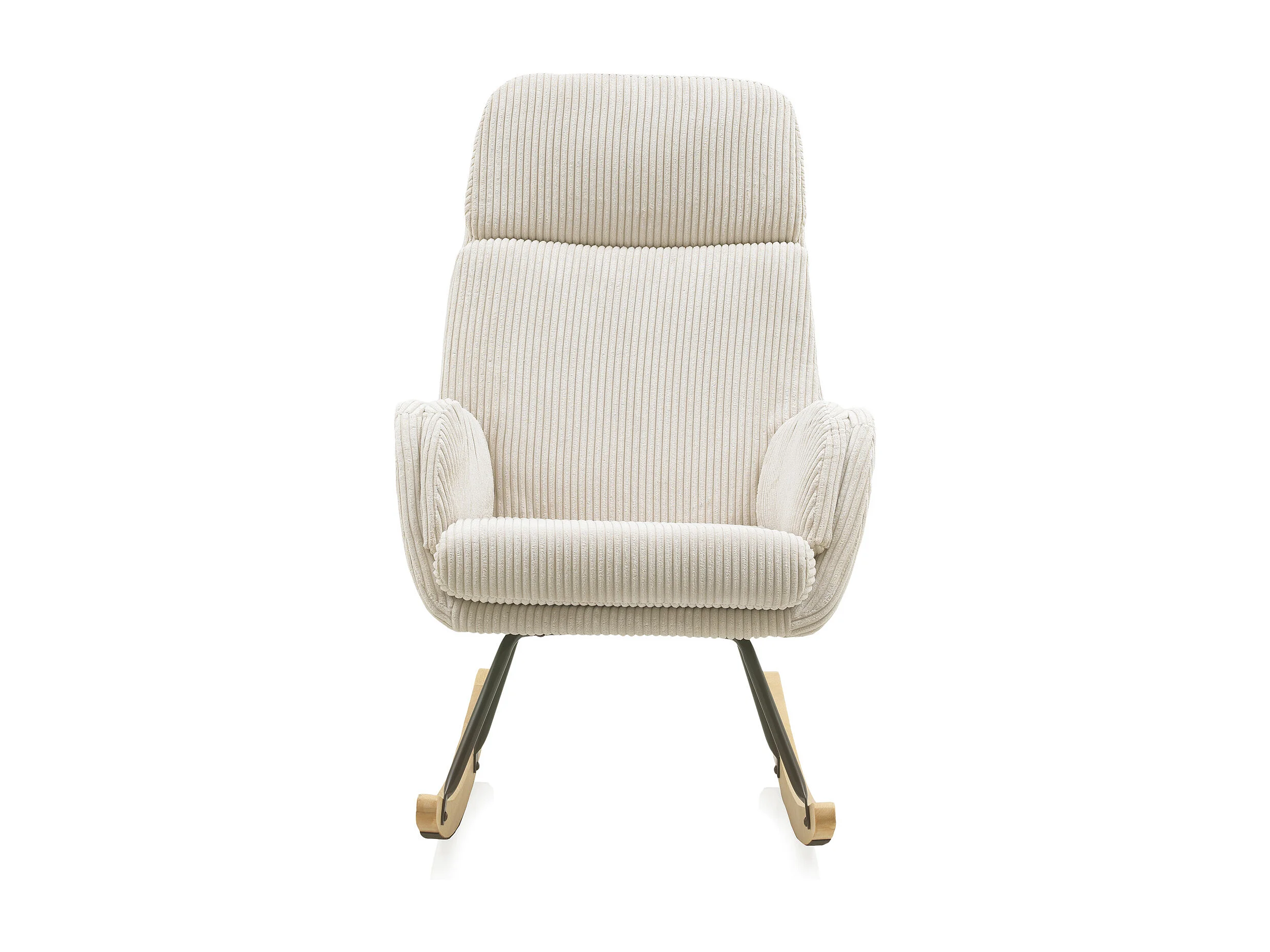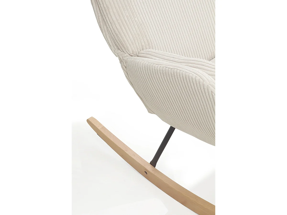 Cadeira de baloiço estofada a bombazina branca, pernas metálicas e base em trenó de madeira de faia.