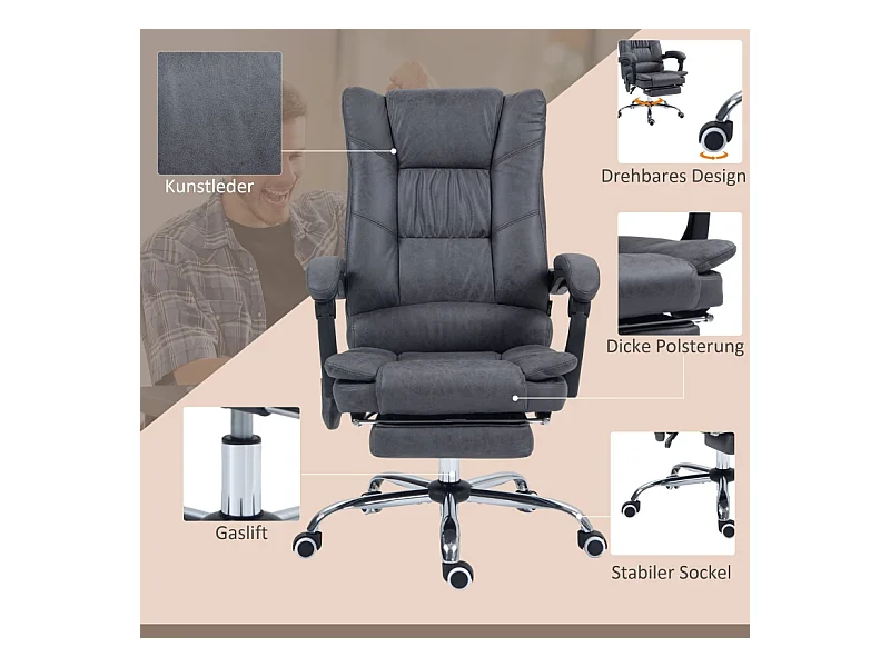 Cadeira de escritório de massagem em microfibra, giratória, ajustável com apoio para os pés, cinza escuro