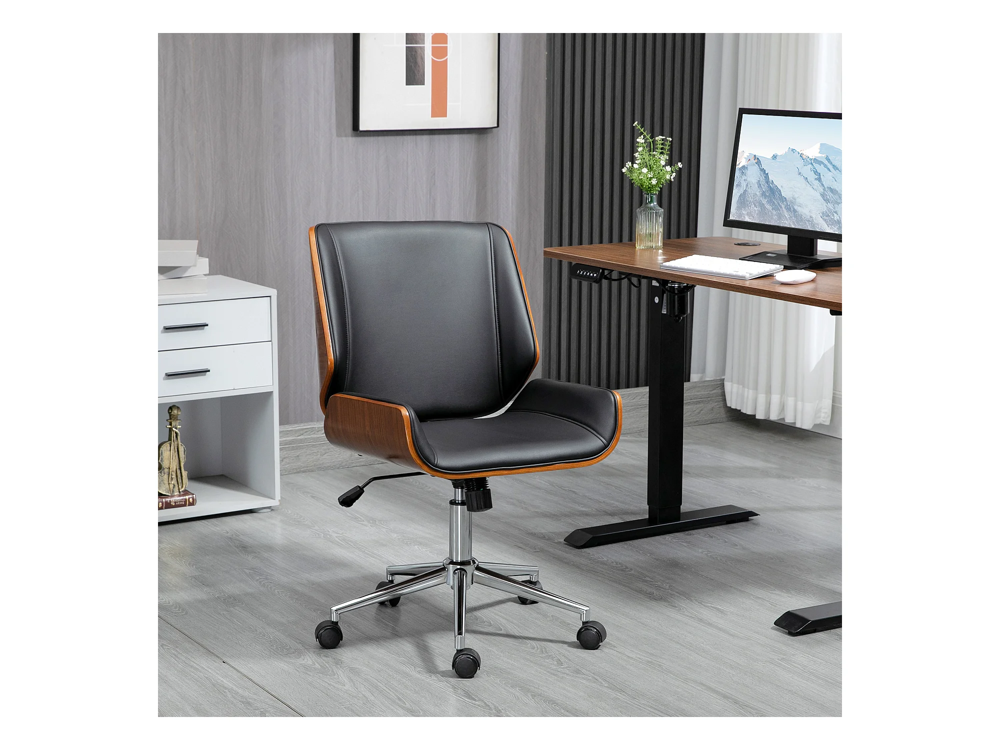 Cadeira de escritório retrô de madeira, couro sintético, giratória e inclinada, preta