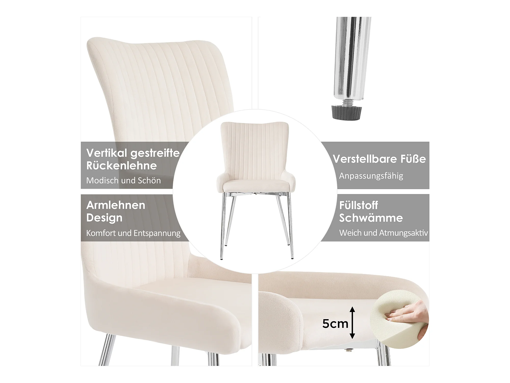 Cadeira de jantar de veludo bege com pernas de metal prateado e apoio lombar para sala de estar e quarto, conjunto de 2