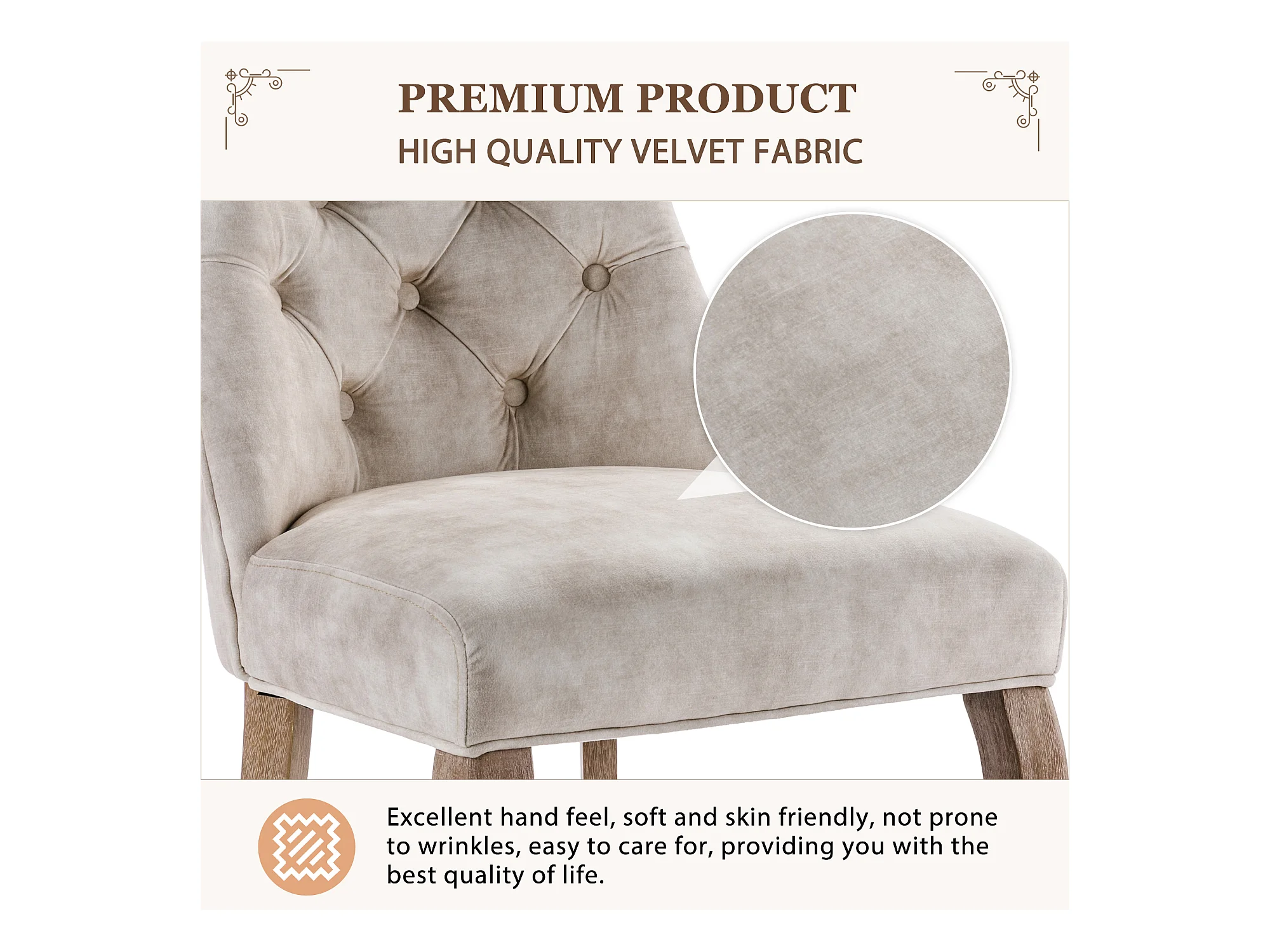 Cadeira de jantar em veludo bege com encosto alto acolchoado e pernas de madeira maciça, 97 x 51 x 47 cm, conjunto de 4