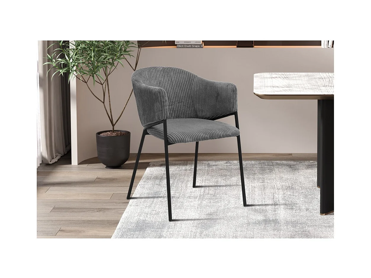 Cadeira de sala de jantar IMANY – Veludo cotelê cinza escuro – Braços – Pés de metal preto – Estilo design / industrial