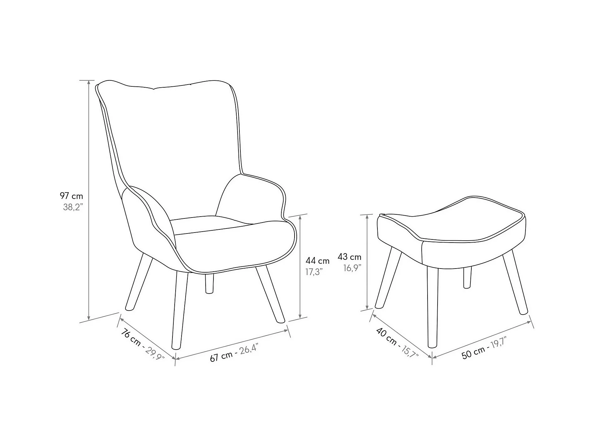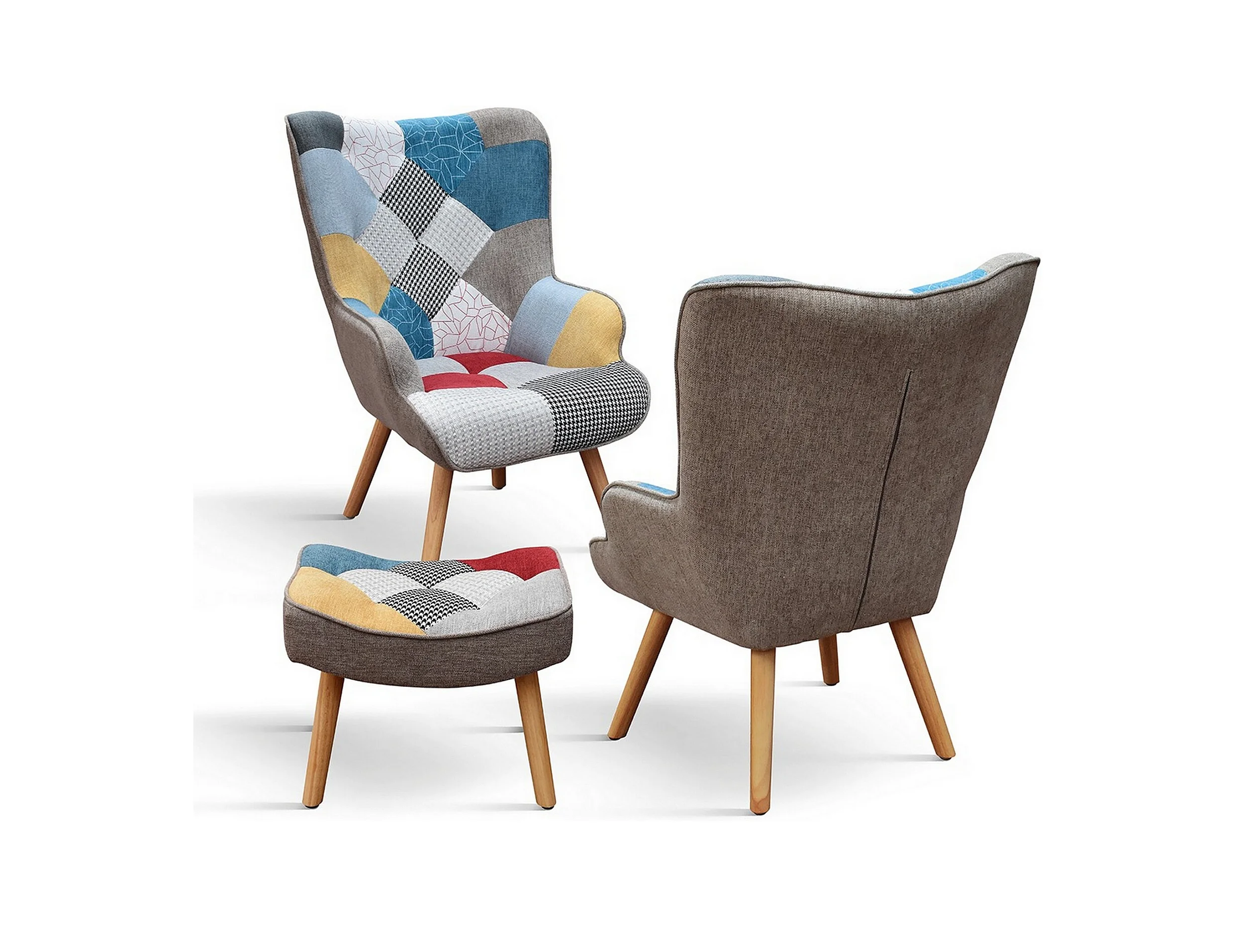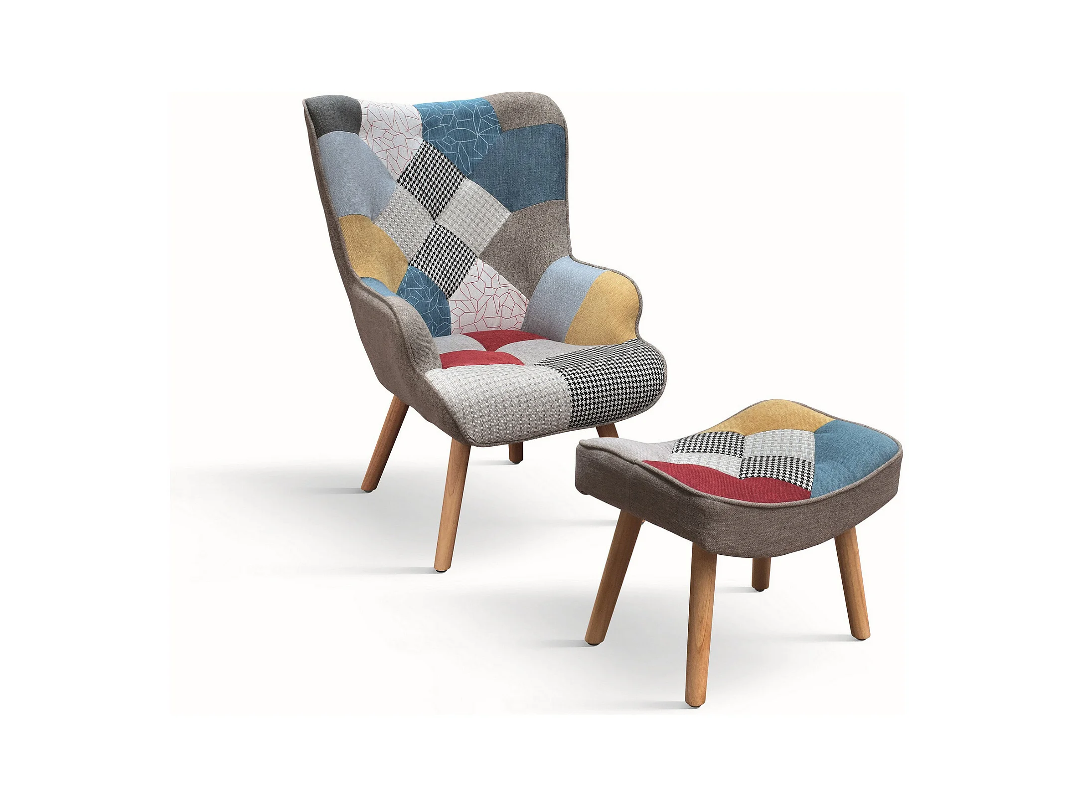 Cadeirão em tecido patchwork multicolorido, pernas de madeira, com apoio para os pés - HAVANA