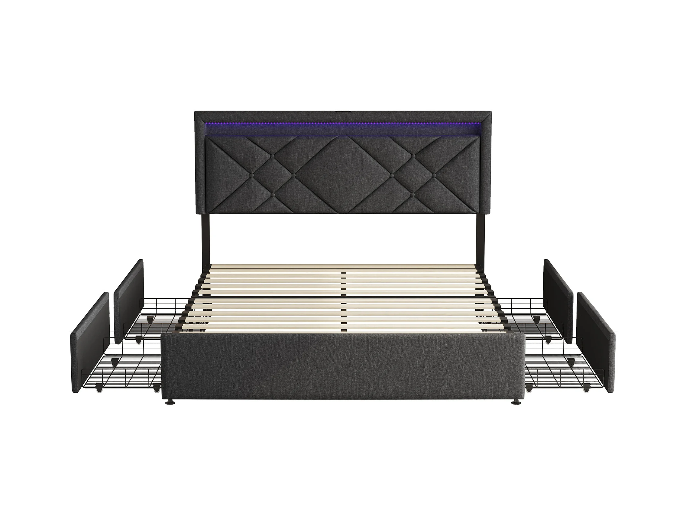 Cama 160x200 com base LED e USB, Cama de casal com ripas, Cama estofada 160x200cm com 4 gavetas e cama de arrumação grande, Cama de casal, Cama 160x200, Cinzento