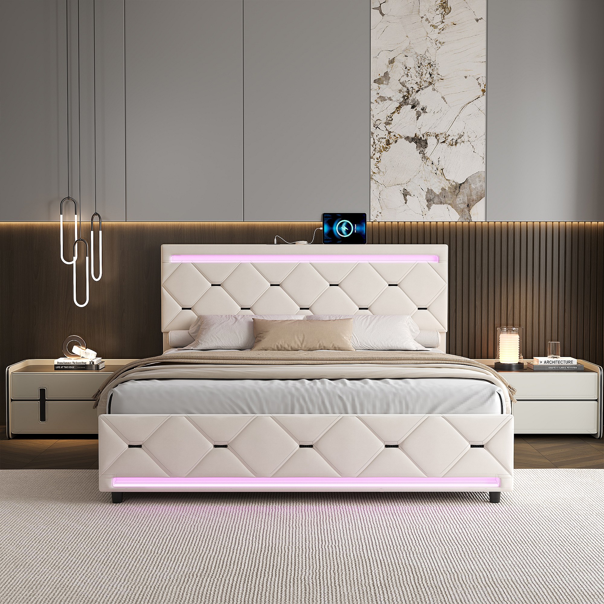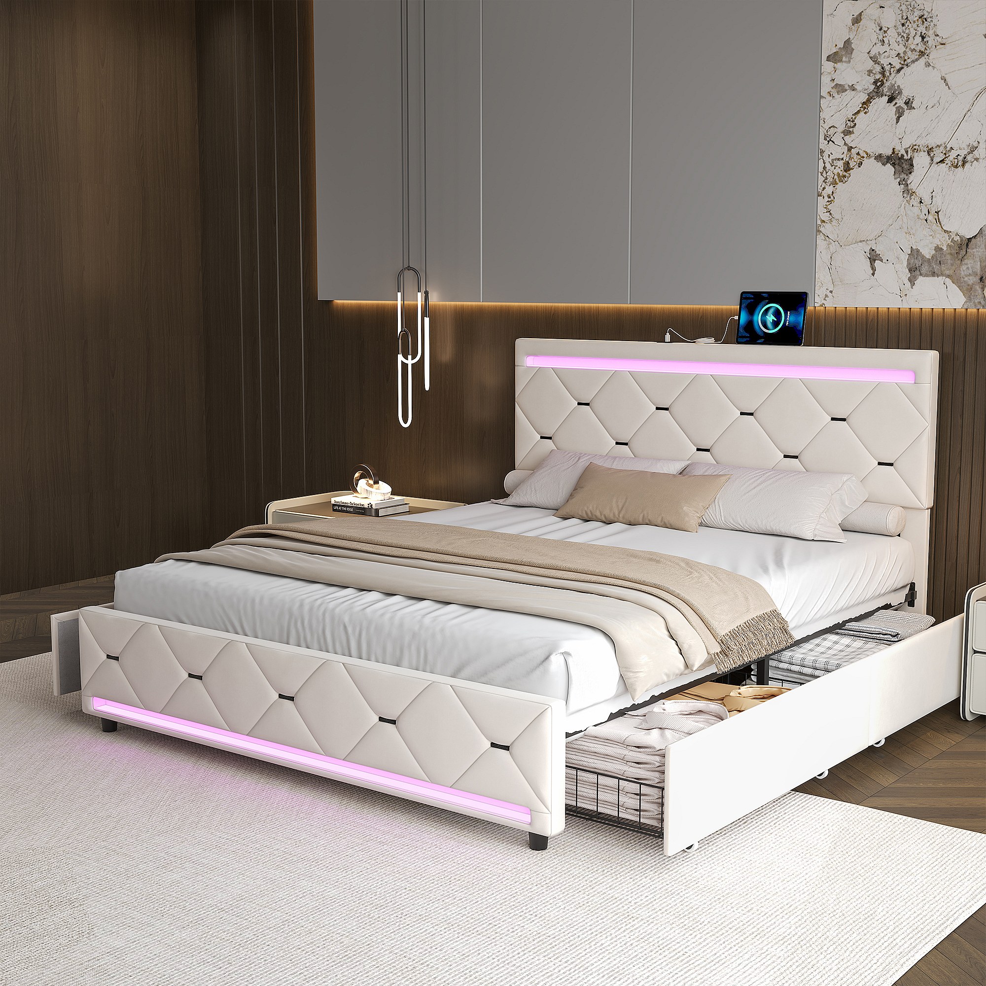 Cama 160x200 com base LED e USB, Cama de casal estofada com 4 gavetas de armazenamento, Branco-sujo