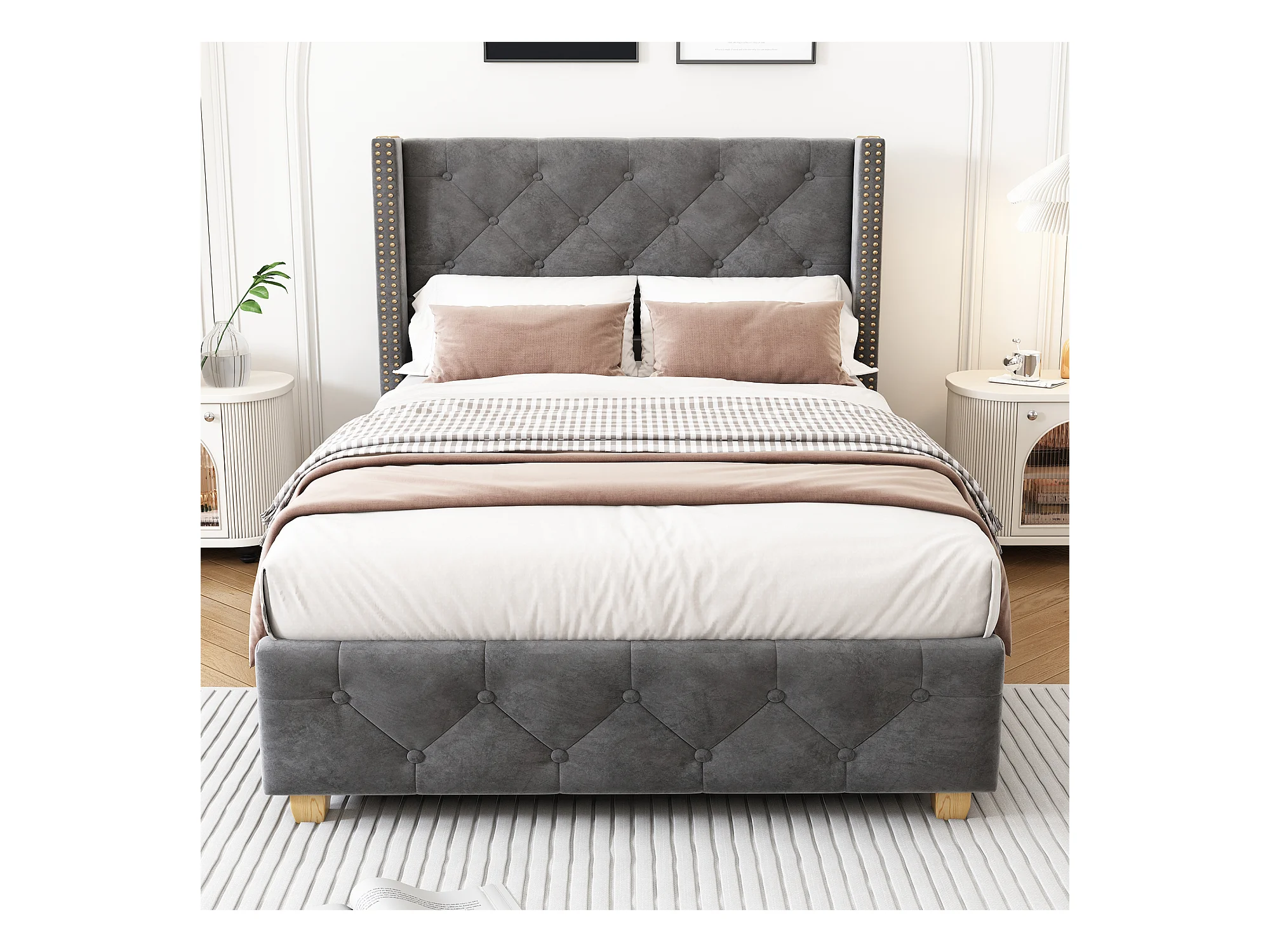 Cama 90x200 cm com estrado e cabeceira capitonê com botões e tachas, em veludo cinza (sem colchão)
