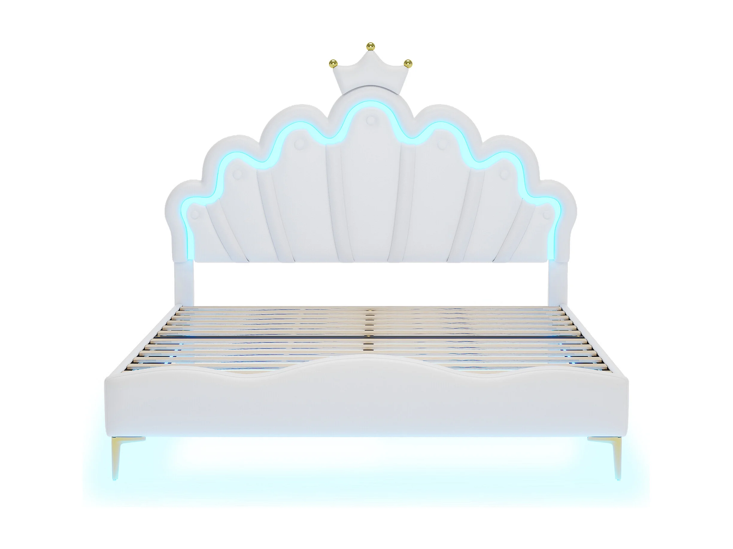 Cama infantil 140x200 cm PU com LED com comando à distância, gavetas e cabeceira regulável branca