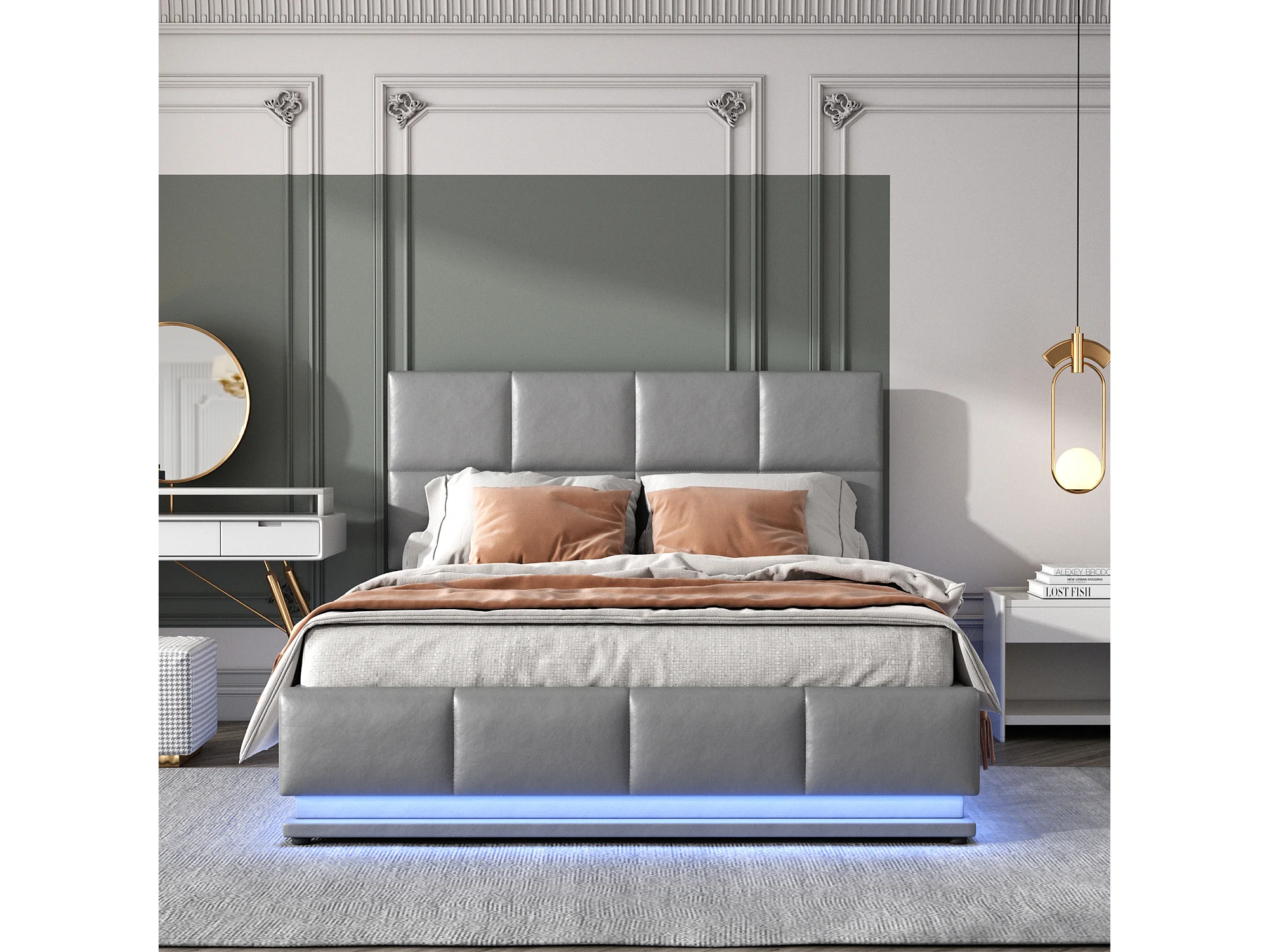 Base de cama 140x190 LED e USB, cama de casal com cabeceira e peseira LED, 4 gavetas de metal, cinza