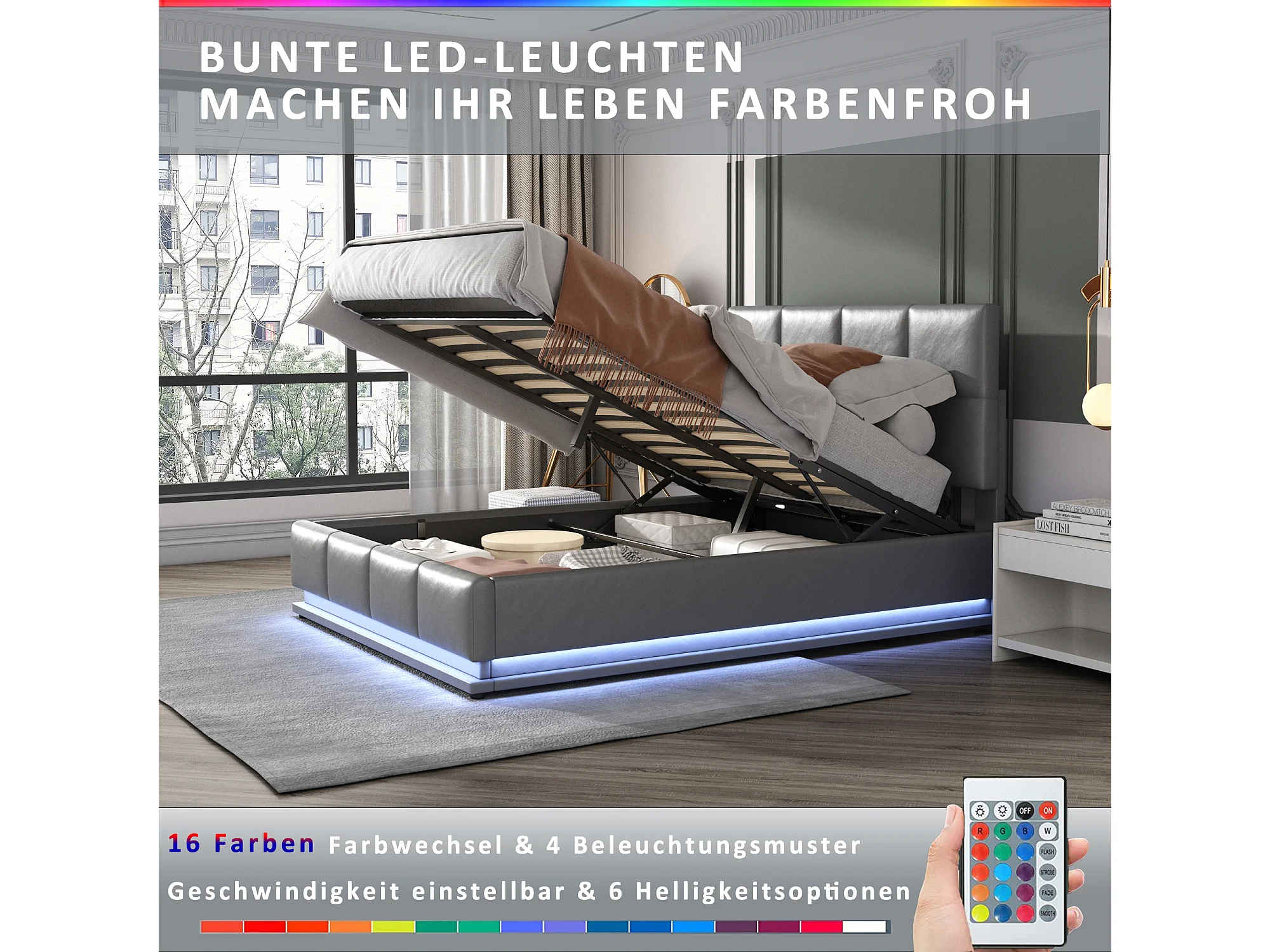 Cama de casal 140 x 200 cm, com LED e USB, gaveta de cama com gavetas, estrado de ripas, cinza escuro