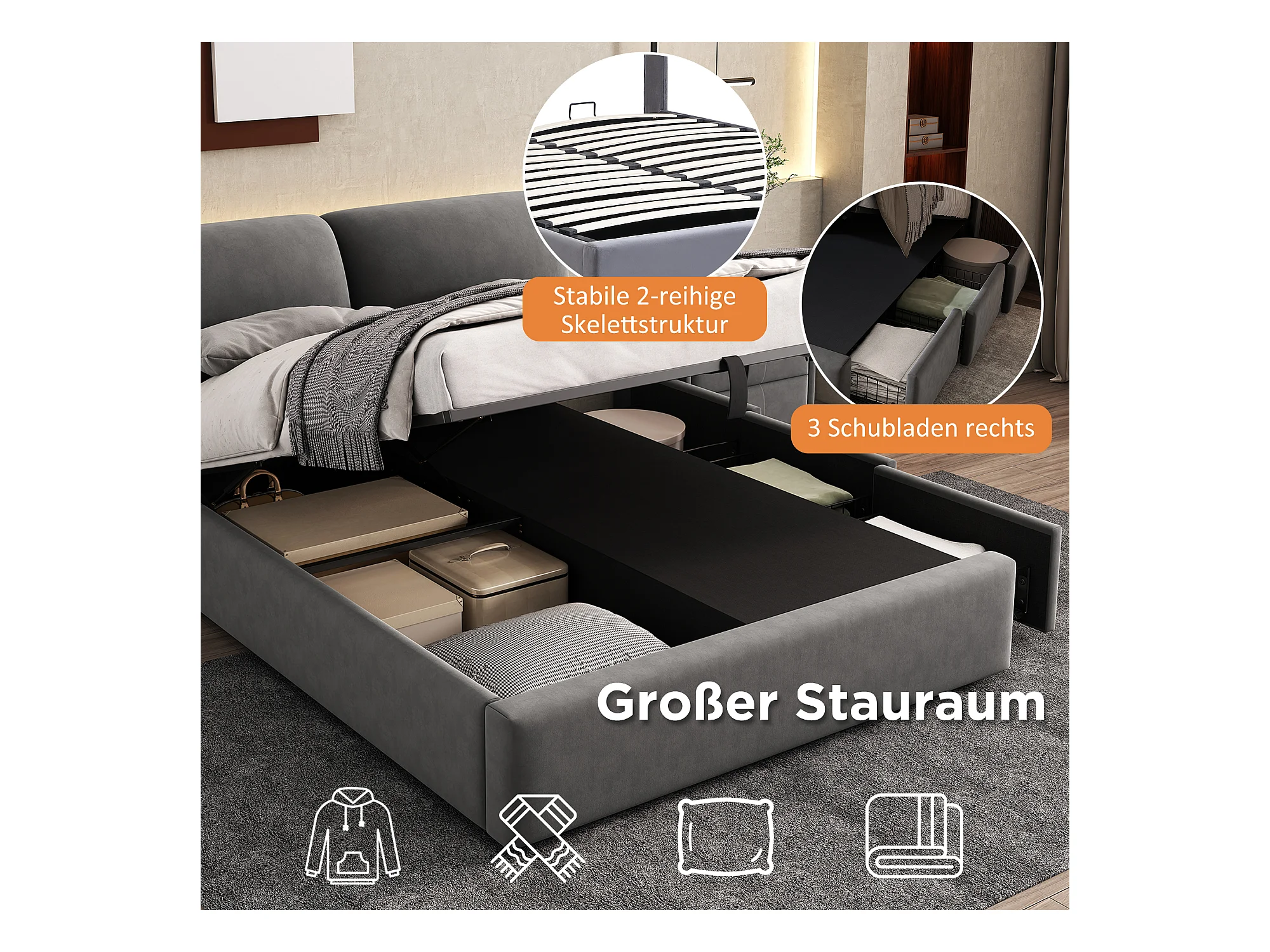 Cama estofada LED 140x200 veludo cinza escuro com armazenamento hidráulico e gavetas integradas