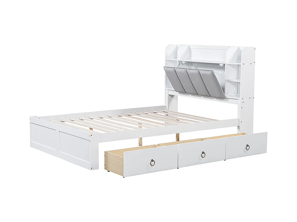 Cama de madeira 140x200 cm com gavetas e armário integrado, cabeceira com armário, MDF, branco, adulto e adolescente