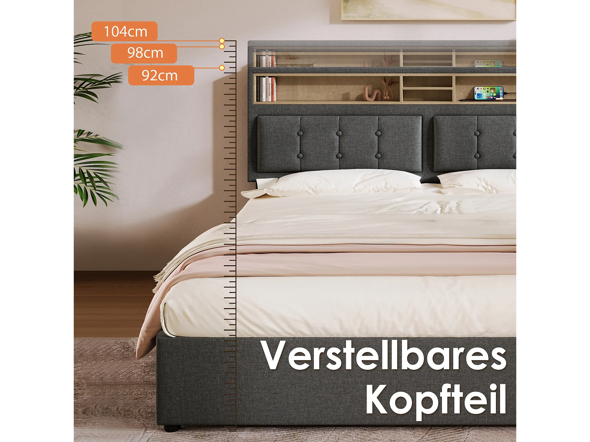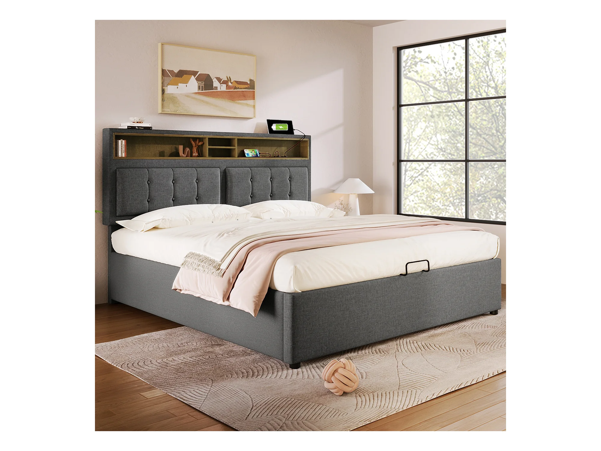 Cama de casal estofada, 160 x 200 cm, com espaço de armazenamento hidráulico, LED, estrado de ripas, cinza