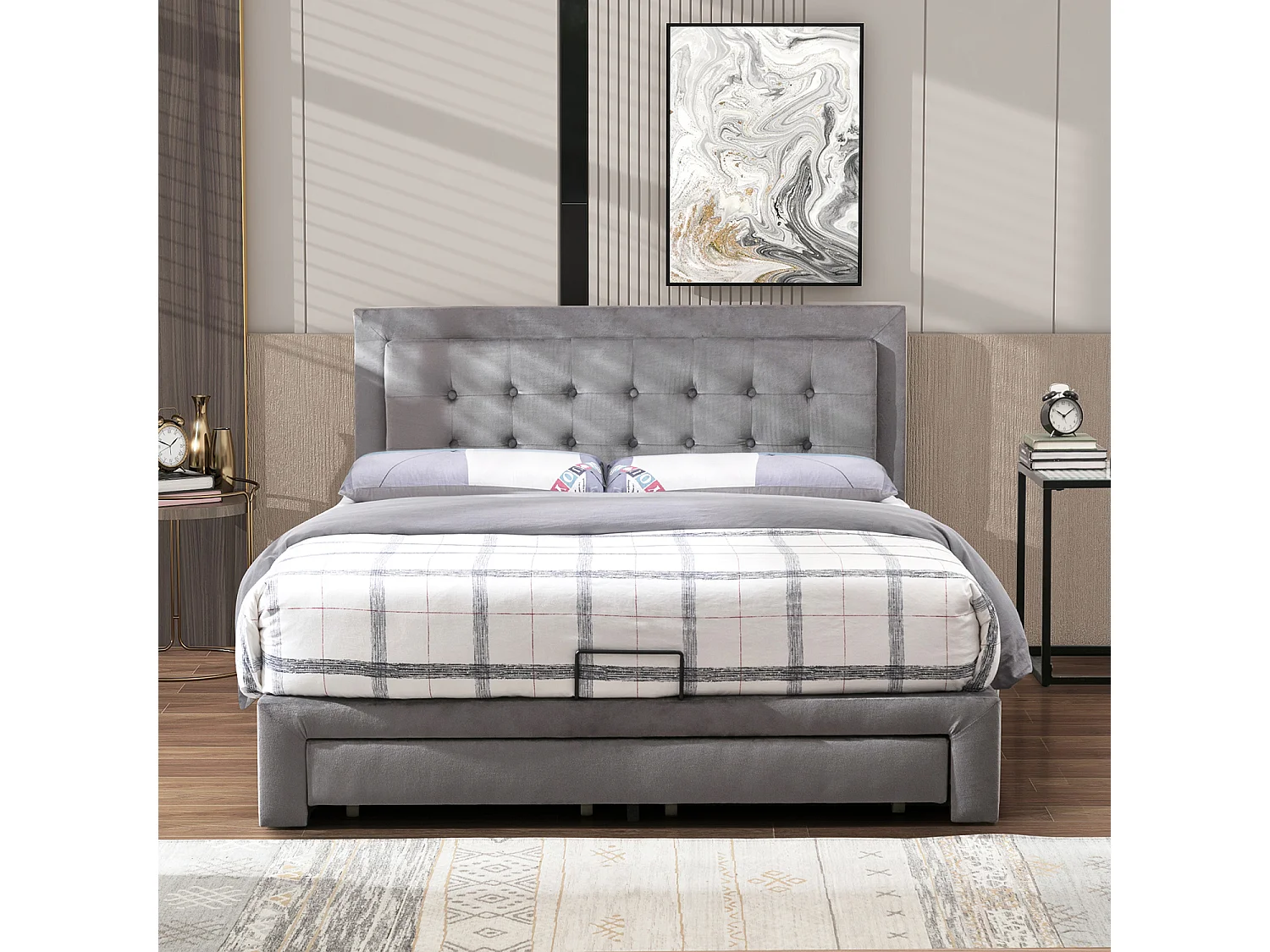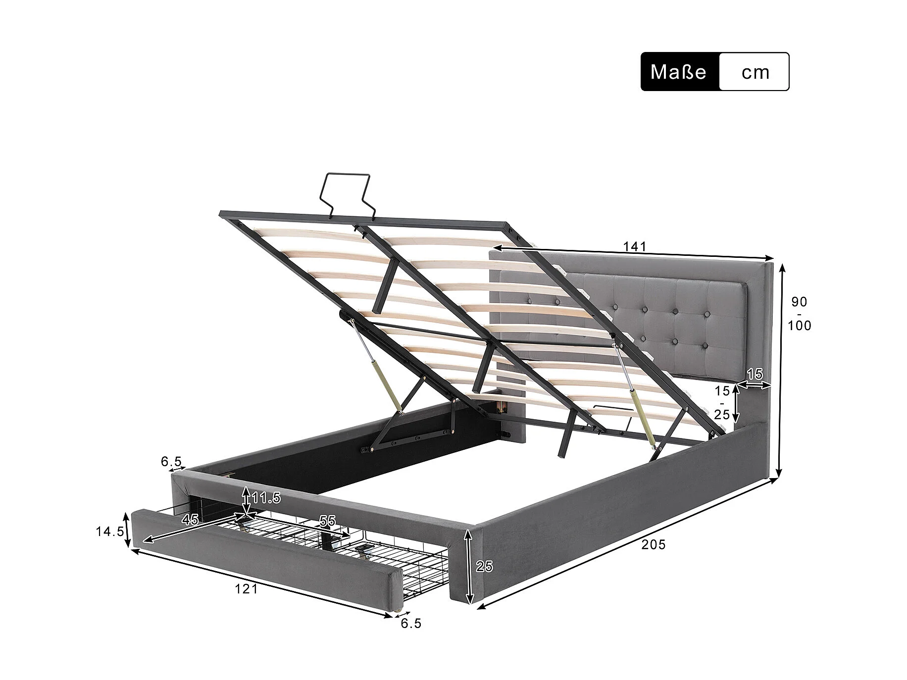 Cama acolchoada para adulto 180 x 1241 cm, sem cabeceira, com faixa LED (monocromática), base com suspensão hidráulica, bege.