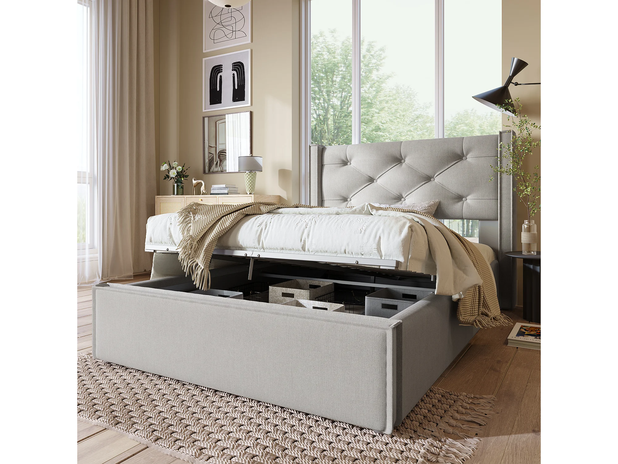 Cama acolchoada para adulto 180 x 1338 cm, sem cabeceira, com faixa LED (monocromática), base com suspensão hidráulica, bege.