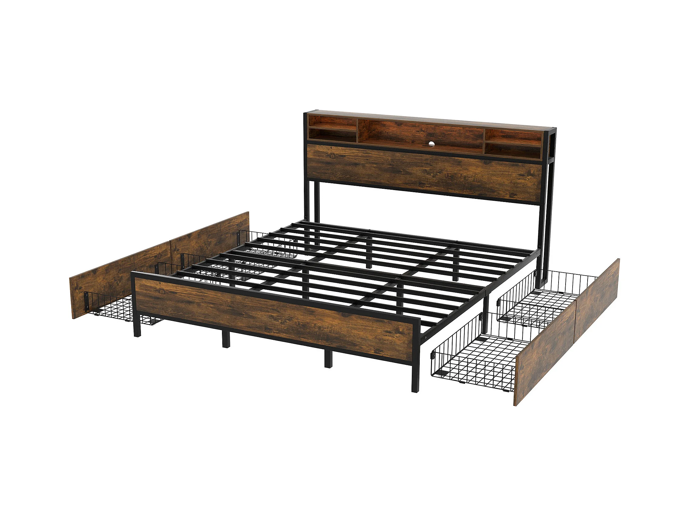 Cama de adulto 180x200 com gavetas integradas - Coleção EOS. Cores em carvalho claro e preto.