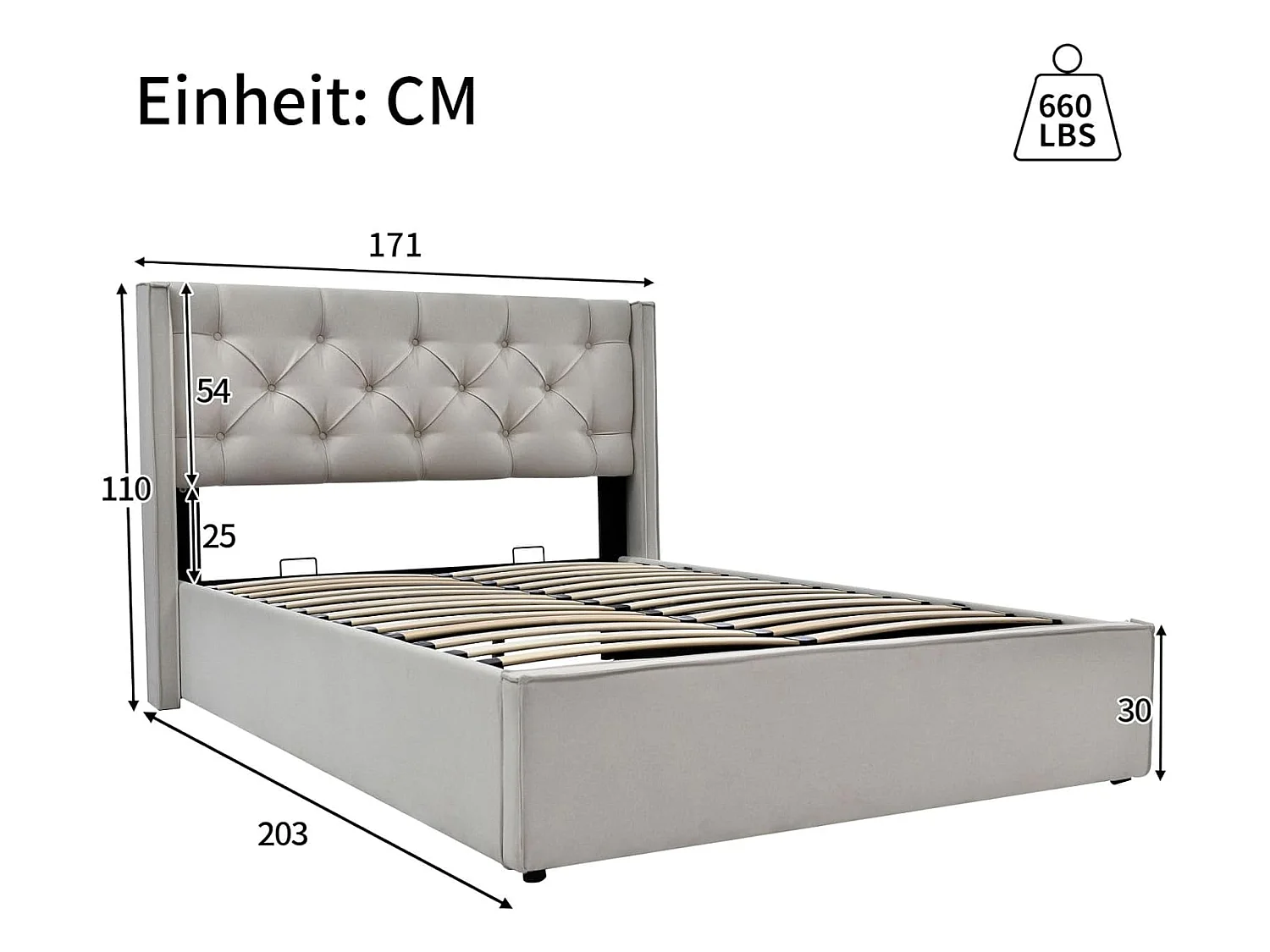 Cama de casal estofada 160x200 com cabeceira LED e carregador USB C, cama hidráulica, cinzento (sem colchão)